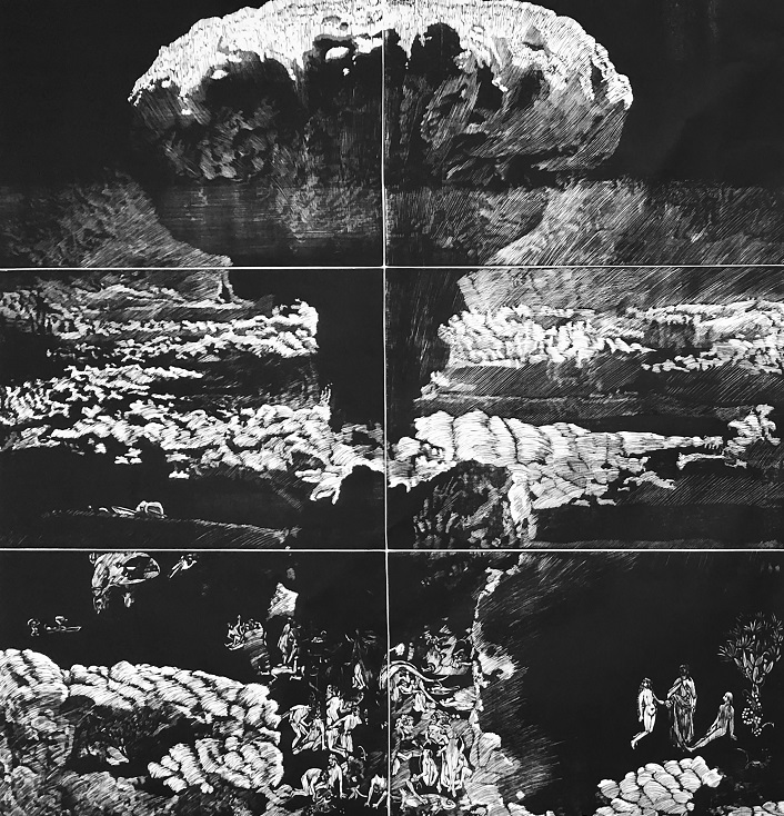 La stretta dialettica tra bianco e nero, positivo e negativo, tipica dell’arte incisoria, rispecchia invece la