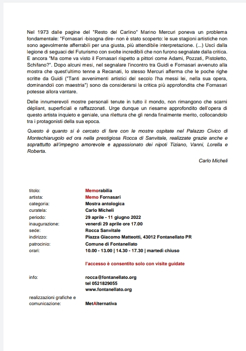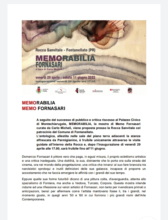 A seguito del successo di pubblico e critica riscosso al Palazzo Civico di Montechiarugolo, MEMORABILIA, la mostra antologica di Memo Fornasari curata da Carlo Micheli, viene proposta presso la Rocca Sanvitale col patrocinio del comune di Fontanellato dal 29 aprile al 11 giugno 2022.