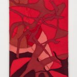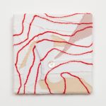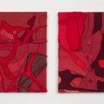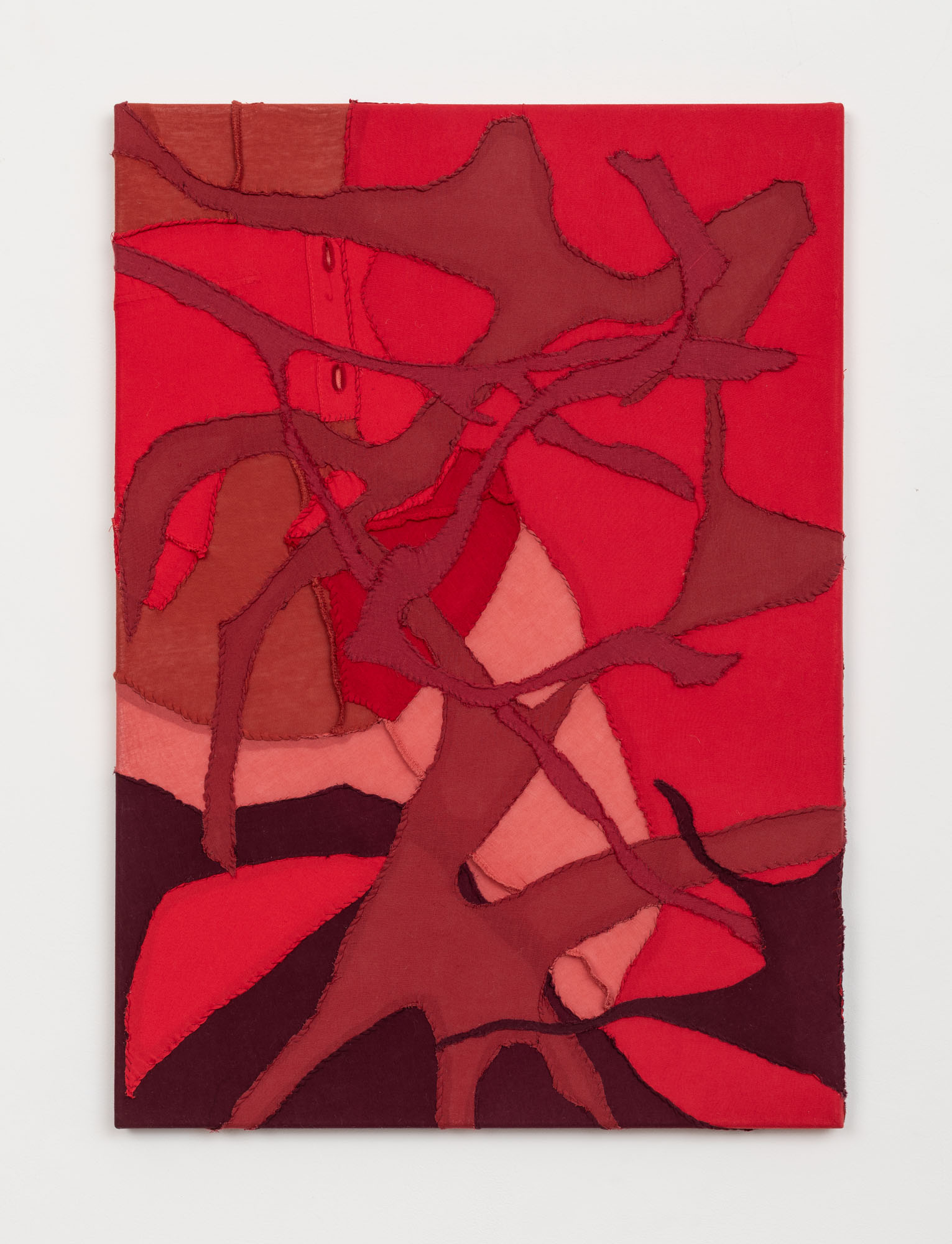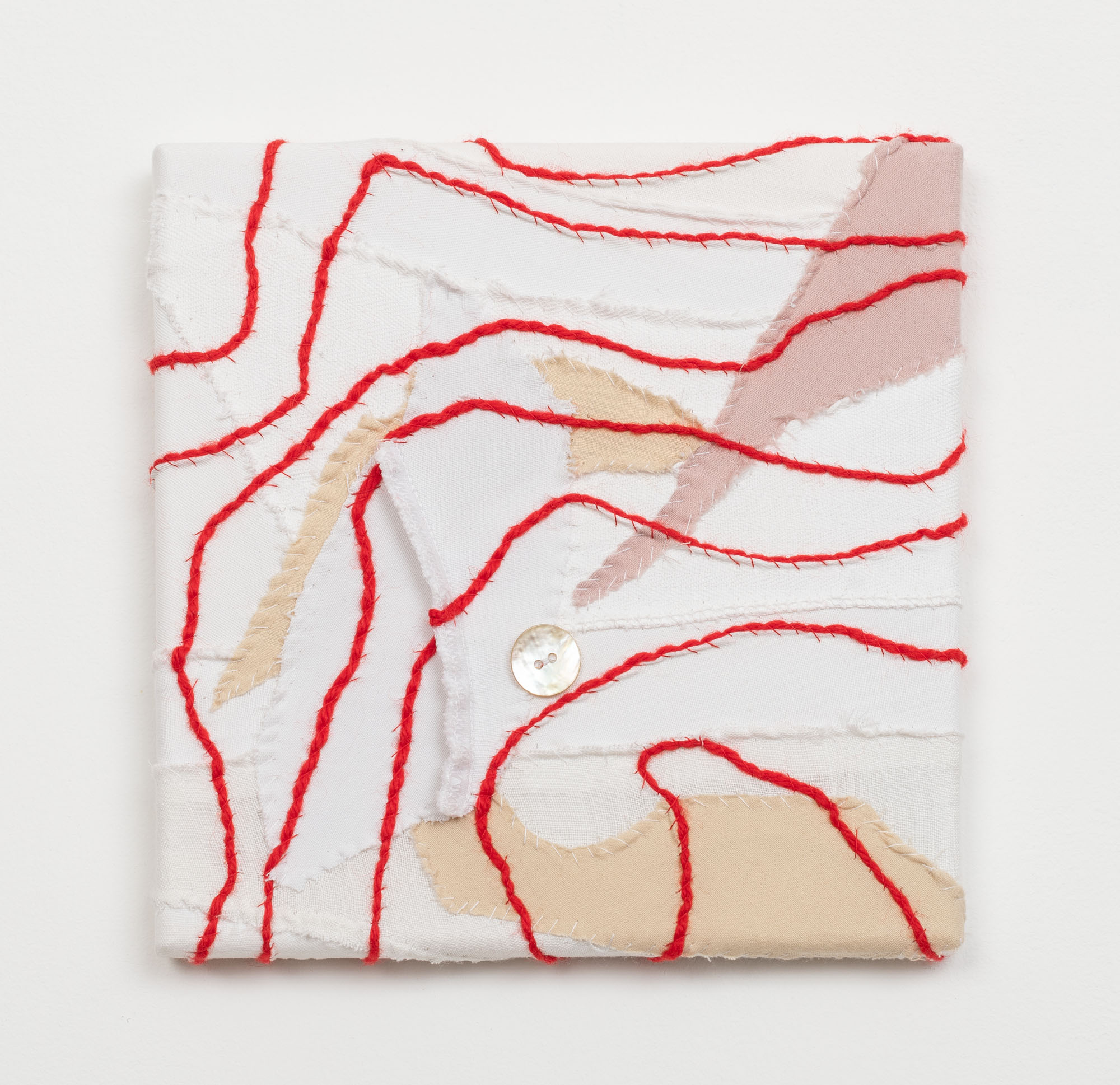 Descrivendo il proprio processo come “dipingere con un ago”, Lino trasforma indumenti medici industriali e tessuti ospedalieri in astrazioni pulsanti e seducenti, cariche di tensione. Questa serie prende forma come un paesaggio corporeo, dove i fili rossi scorrono attraverso stoffe neutre come vene e arterie, evocando il sistema cardiovascolare. Il contrasto tra i rossi intensi e il bianco sterile suggerisce al contempo la vitalità del corpo e la precisione degli ambienti medici. Le trame cucite, simili a suture chirurgiche, trasformano le cicatrici – fisiche e psicologiche – in un linguaggio visivo di riparazione e resilienza.