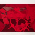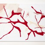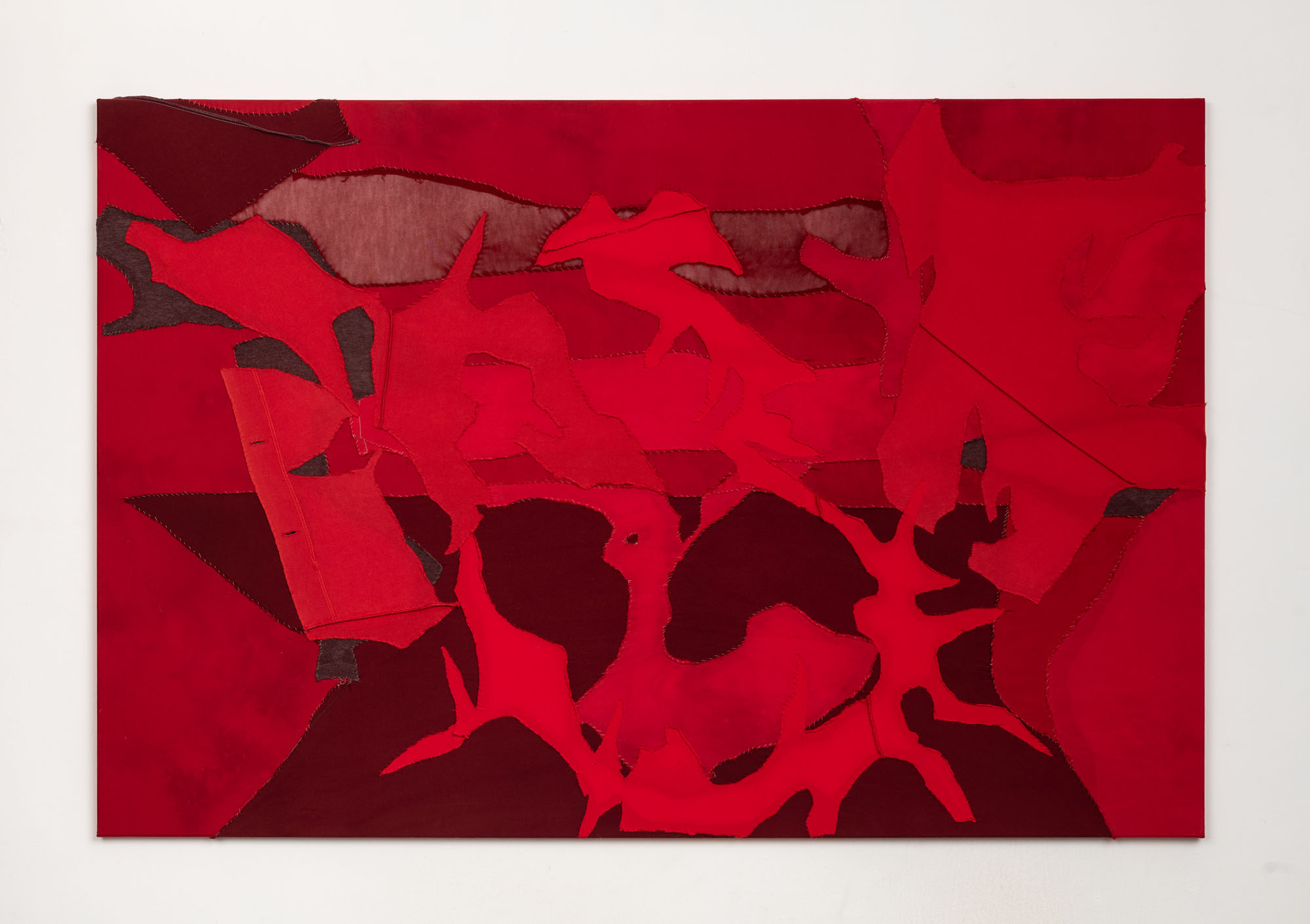 In un’opera site-specific, scampoli delle divise chirurgiche del padre e indumenti personali dell’artista sono cuciti insieme con il filo appartenuto alla madre, legando memoria generazionale ed eredità familiare in una composizione tattile. Il risultato è una mappa emotiva verticale, dove fili rossi sottili attraversano strati di tessuto come capillari. Gocce seducenti di rosso e cuciture in rilievo riecheggiano l’astrazione pittorica e le forme anatomiche, donando all’opera una straordinaria forza psicologica.