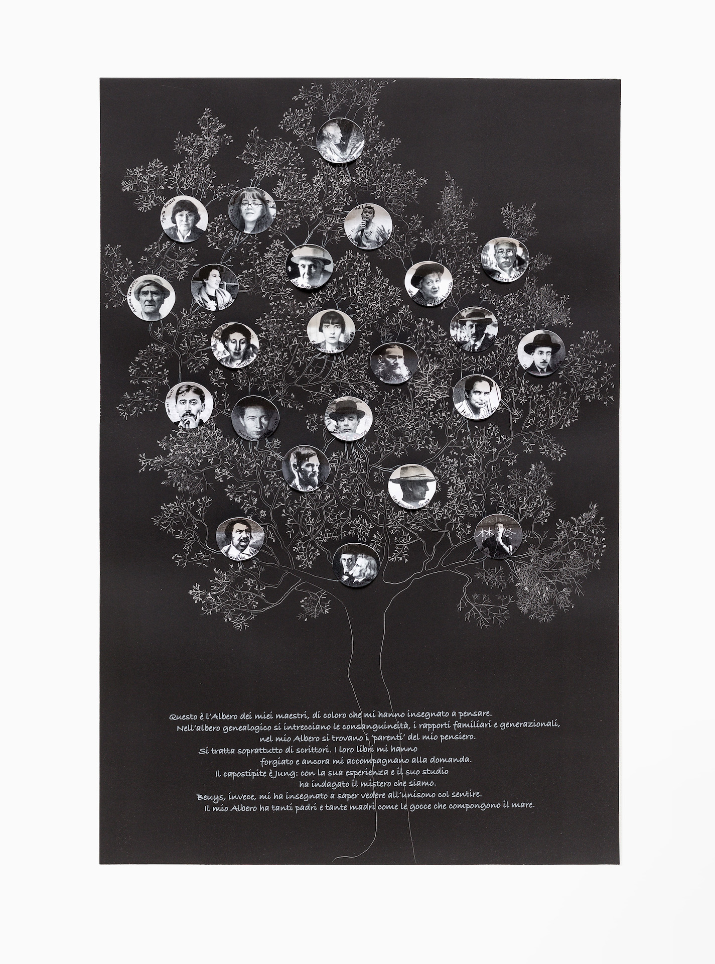 I lavori in mostra ripensano la figura dell’albero, spesso descritto come identità forte, caparbia, patriarcale. La sua struttura suggerisce una gerarchia rigida: il tronco centrale rappresenta l’autorità maschile, mentre rami e radici assumono ruoli subordinati. La crescita, orientata verso l’alto, sottolinea una visione lineare e ascendente del potere, tipica della logica patriarcale. L’opera° Albero Genealogico° (2019) propone invece un manifesto matriarcale, apparendo come un pensiero orizzontale e riproduttivo, un sapere che rivendica l’altro nominandolo e richiamandolo al presente. È un atto anacronistico, che celebra una forma di condivisione e ridefinisce il senso di appartenenza al vivente.
