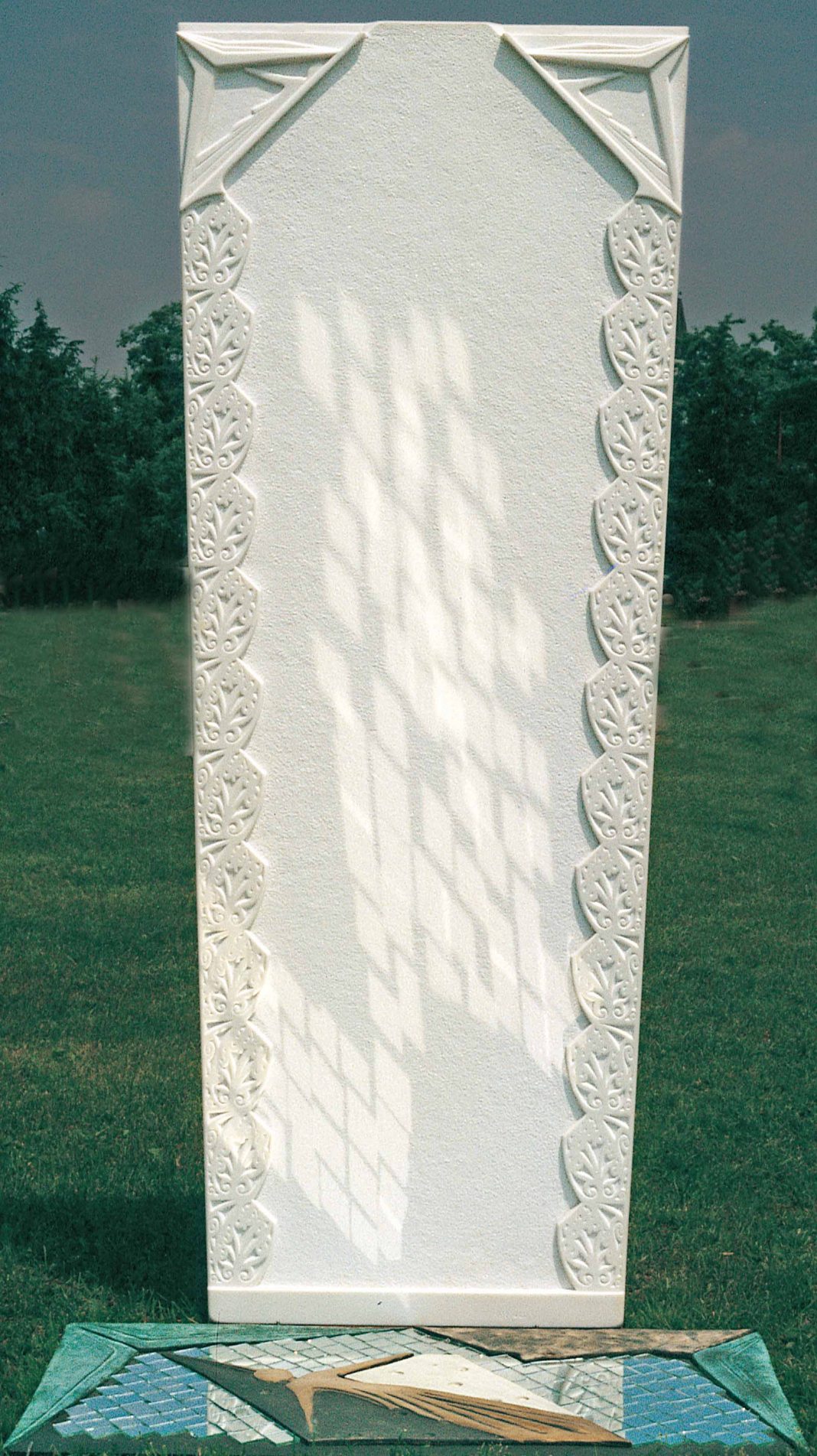 Meridiana è nata alla fine degli anni ’90 per un mio grande desiderio di creare con il candore della pietra una stele che si ergesse verso l’infinito. L’associazione con l’altra mia opera Ali per Icaro, i cui specchi riflettono la luce del sole sulla stele, ne è stata corollario immediato.
