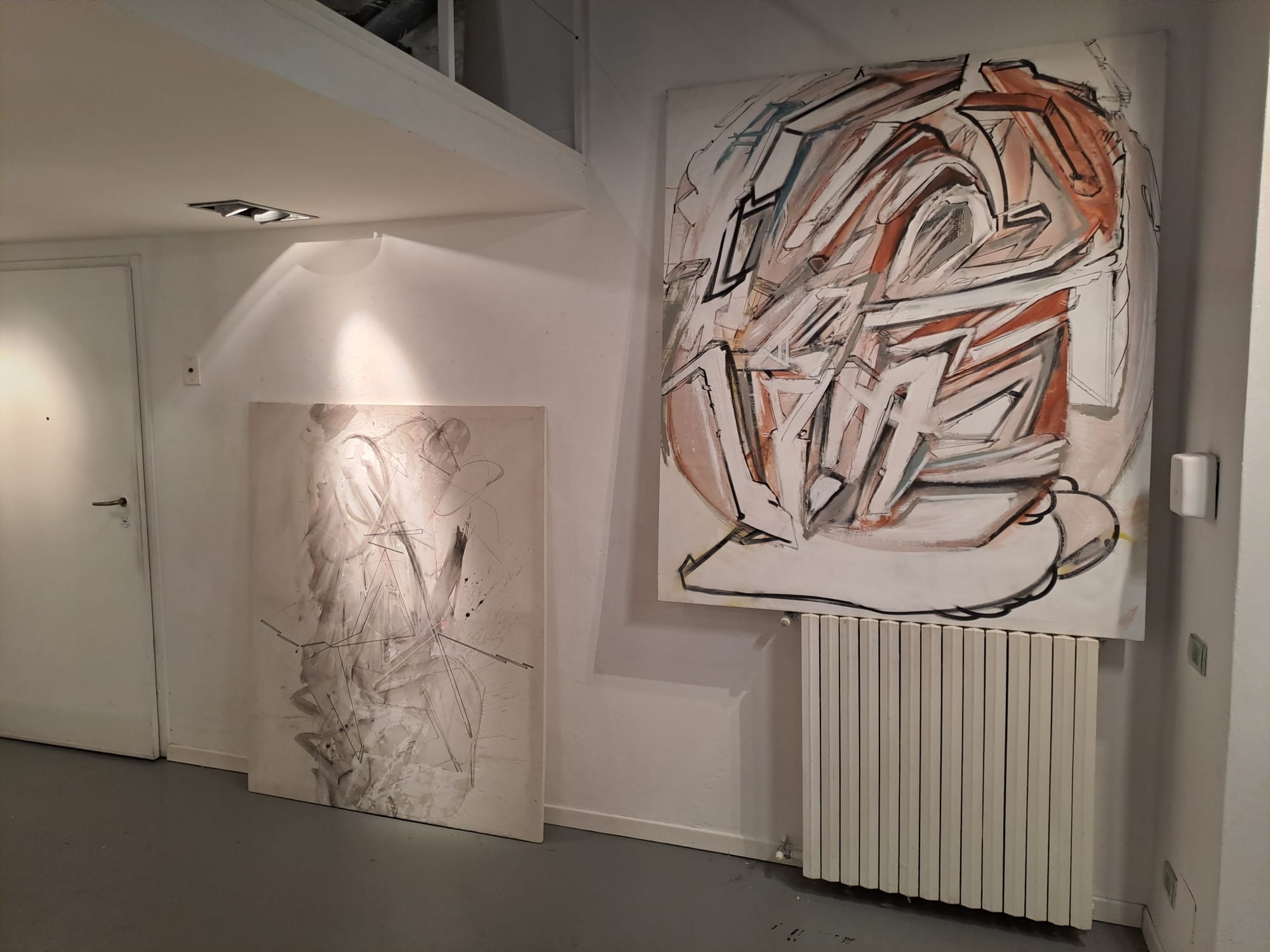 I lavori in mostra sono la testimonianza delle varie fasi di questo passaggio. Alcune mostrano il rapporto diretto con la strada e con la comunicazione scritta con lettere che diventano forme astratte. Altre opere raffigurano lo studio geometrico delle proporzioni da inserire nello spazio in dialogo con il caos dell’azione non controllata.