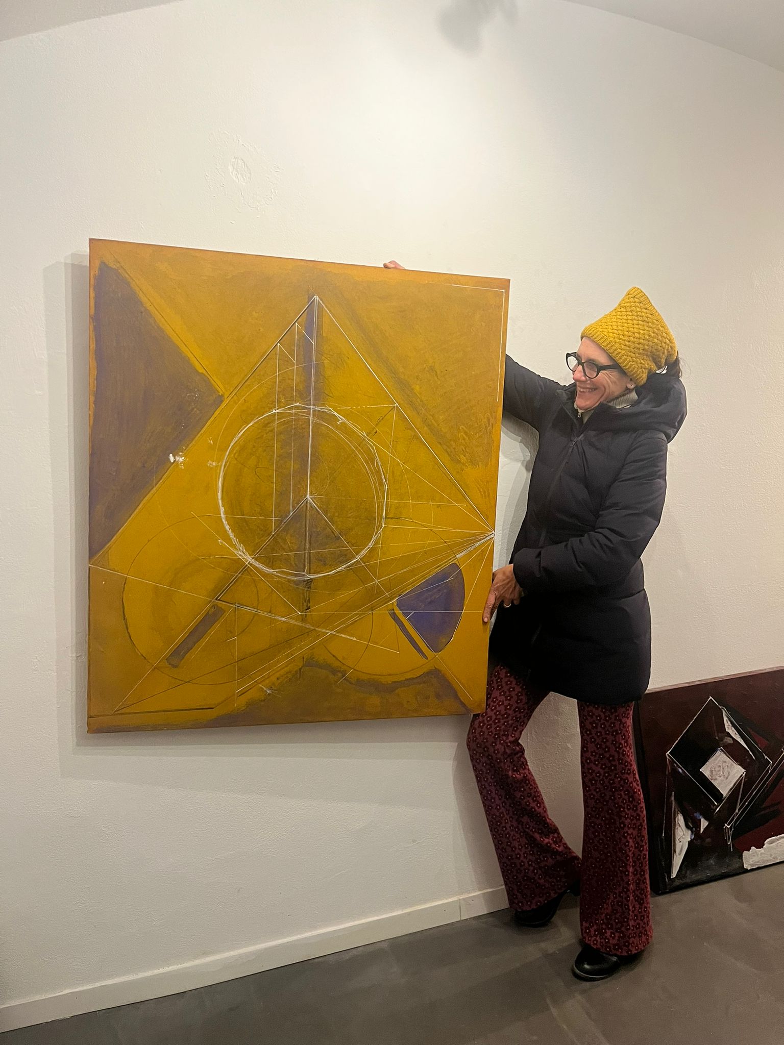 Tra rigore e action paiting le opere di META LEONE risultano attuali per il richiamo a un passato recente da riscoprire e su cui riflettere e per l’attenzione al recupero di materiali di scarto. L’opera “Architettura miope circolare” per esempio, esposta al piano di sotto della galleria di Via Lanzone 23, è realizzata a partire da una tela recuperata probabilmente già opera d’arte scartata per dar spazio a nuove esigenze.