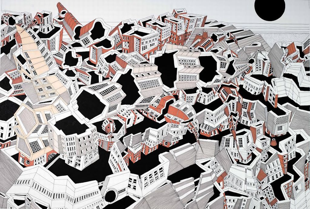 Intesa nelle sue diverse accezioni, la metropoli viene interpretata con attenzione vedutistica (Sandro Bini, Giorgio Cavalieri) o riletta, nel solco del genere del paesaggio d’invenzione, con soluzioni che, a seconda del caso, si presentano come caotiche, deliranti quanto suggestive visioni dominate da un attualissimo senso di instabilità (Mauro Brinciotti, Marco Tamburro) o come spazi in cui la referenzialità dell’immagine, ridotta al minimo negli impasti pittorici, riemerge prepotentemente, inglobata nella ridondanza materica, con preziosi frammenti fotografici di una descrittività accattivante e identitaria (Paola Romano)