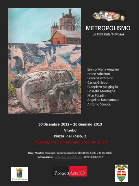 L’attualità della mostra di Viterbo, “Metropolismo, la fine dell’euforia”, è già sottolineata dal titolo. Come le precedenti è una collettiva e segue lo stesso schema temporale suddividendo il percorso in tre decenni ma, diversamente dalle precedenti, vuole sottolineare l’aspetto più attuale rappresentato dalla fine di quell’euforia collettiva che ha caratterizzato gli anni ’80 e buona parte degli anni ’90.