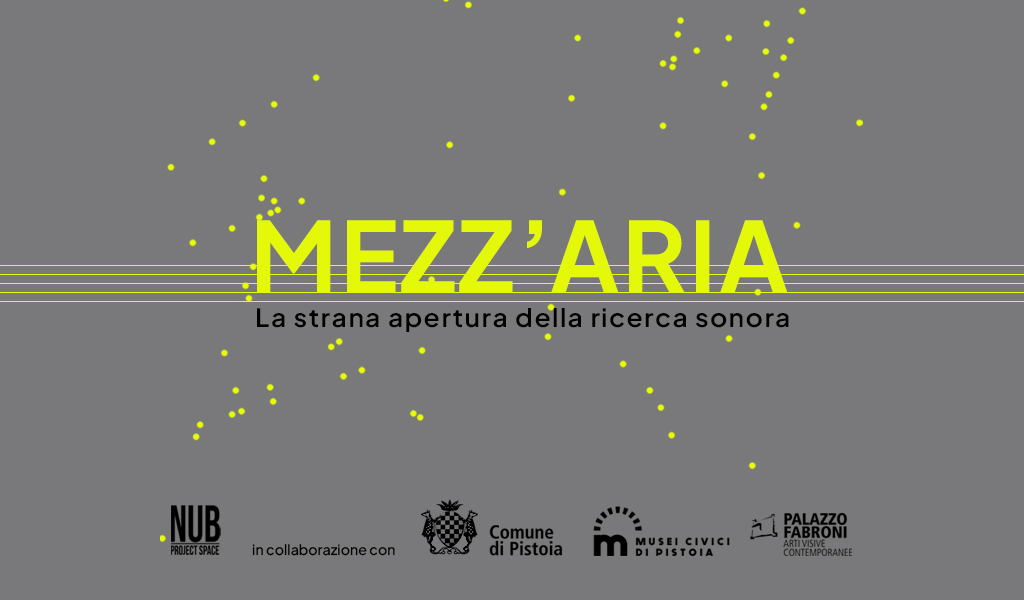 Pistoia, 17 maggio 2023 – Venerdì 19 maggio alle ore 19 inaugura «Mezz'aria. La strana apertura della ricerca sonora», collettiva che espone le ricerche attorno al suono di 16 artisti italiani negli spazi del Museo del Novecento e del Contemporaneo di Palazzo Fabroni di Pistoia. Sviluppata con modalità espositive ibride, si espande nel corso del periodo di apertura - dal 20 maggio al 25 luglio 2023 - in altri luoghi del museo e della città attraverso un calendario di interventi dal vivo. Il progetto è a cura di Nub e di Gabriele Tosi ed è realizzato da Nub Project Space in collaborazione con Comune di Pistoia/Musei Civici/Museo del Novecento e del Contemporaneo di Palazzo Fabroni.