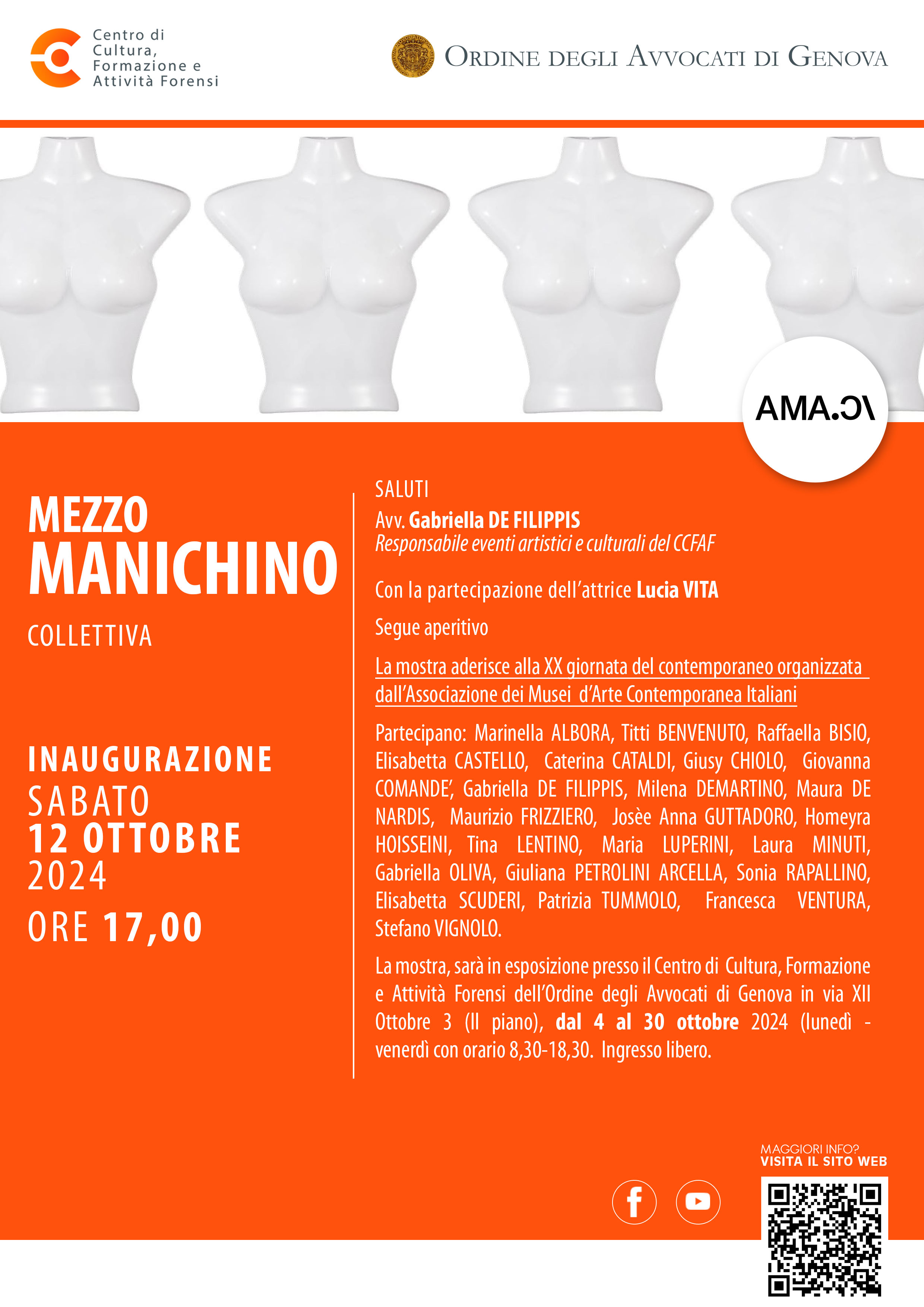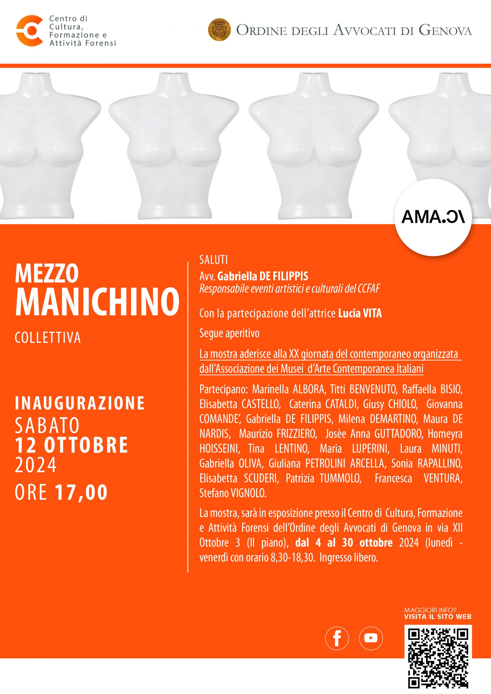 Sabato 12 ottobre 2024, alle ore 17,00, nei locali del Centro Cultura Formazione e Attività Forensi, in via XII ottobre 3, sarà inaugurata le mostra MEZZO MANICHINO.