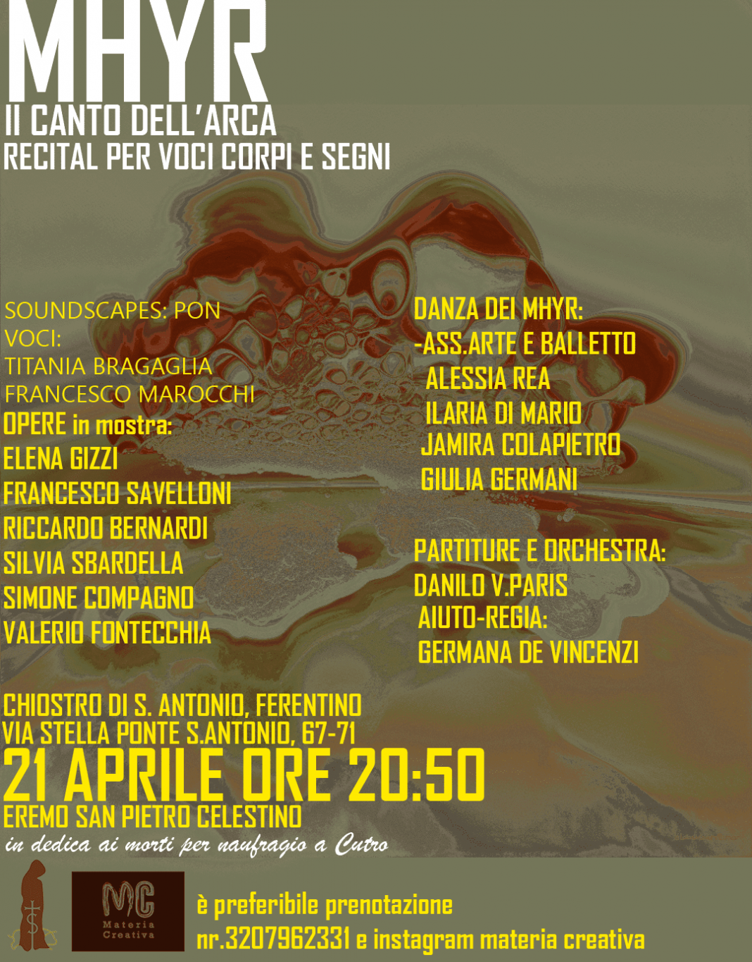 Si comunica che il 21 Aprile alle ore 20:50 si terrà il Recital per voci corpi segni Mhyr: II Canto dell’Arca, presso il chiostro della chiesa di S. Antonio, Ferentino, con il patrocinio della chiesa stessa, Eremo San Pietro Celestino, con opere pittoriche di Elena Gizzi, Francesco Savelloni, Riccardo Bernardi, Simone Compagno, Silvia Sbardella, a cura e con il secondo canto di ARCA “poema per corpi fragili” di Danilo Paris, con la programmazione dell’ Ass.Materia Creativa.