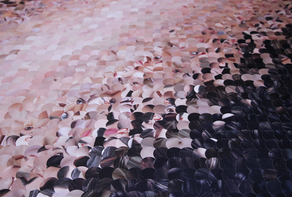 Il corpo espande il suo raggio d’azione ondeggiando in uno spazio illimitato. Le fisionomie si disperdono dalle proprie fattezze, tessono trame di un’inedita prospettiva geografica, i tasselli d’epidermide si ricompongono nella mescolanza di pelle, ciglia, capelli, unghie in una geometria dai contorni organici e sociali.