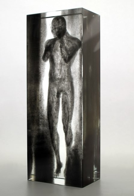 A partire dal 2007, in seguito ad anni di sperimentazioni, Michal Macku è giunto alla seconda fase del suo processo creativo, riuscendo nel suo intento di dare tridimensionalità alla fotografia analogica avvalendosi della trasparenza del vetro. L’artista interviene su un blocco di vetro temperato realizzato in Germania, che suddivide in più lastre, su ognuna delle quali imprime in camera oscura vari negativi: impresso il negativo sulla prima lastra, Macku vi fa aderire la seconda lastra con una colla speciale e, una volta attaccata, stampa il negativo successivo e così via, fino all’ultima lastra, ottenendo nuovamente -attraverso l’ausilio dei raggi UVA- un blocco unico. Si tratta di un procedimento lungo e di estrema precisione, dal momento che anche la più piccola sbavatura può compromettere l’intero lavoro. Questa tecnica assolutamente innovativa e rivoluzionaria prende il nome di Glass Gellage, ed è il risultato della trasposizione su vetro delle due tecniche fotografiche di cui Michal Macku è maestro assoluto: il Gellage e il Carbon Print. In questi suoi ultimi lavori, tutti rigorosamente in bianco e nero, le figure appaiono sospese in volo, fluttuando in una dimensione in cui il tempo e lo spazio si annullano.