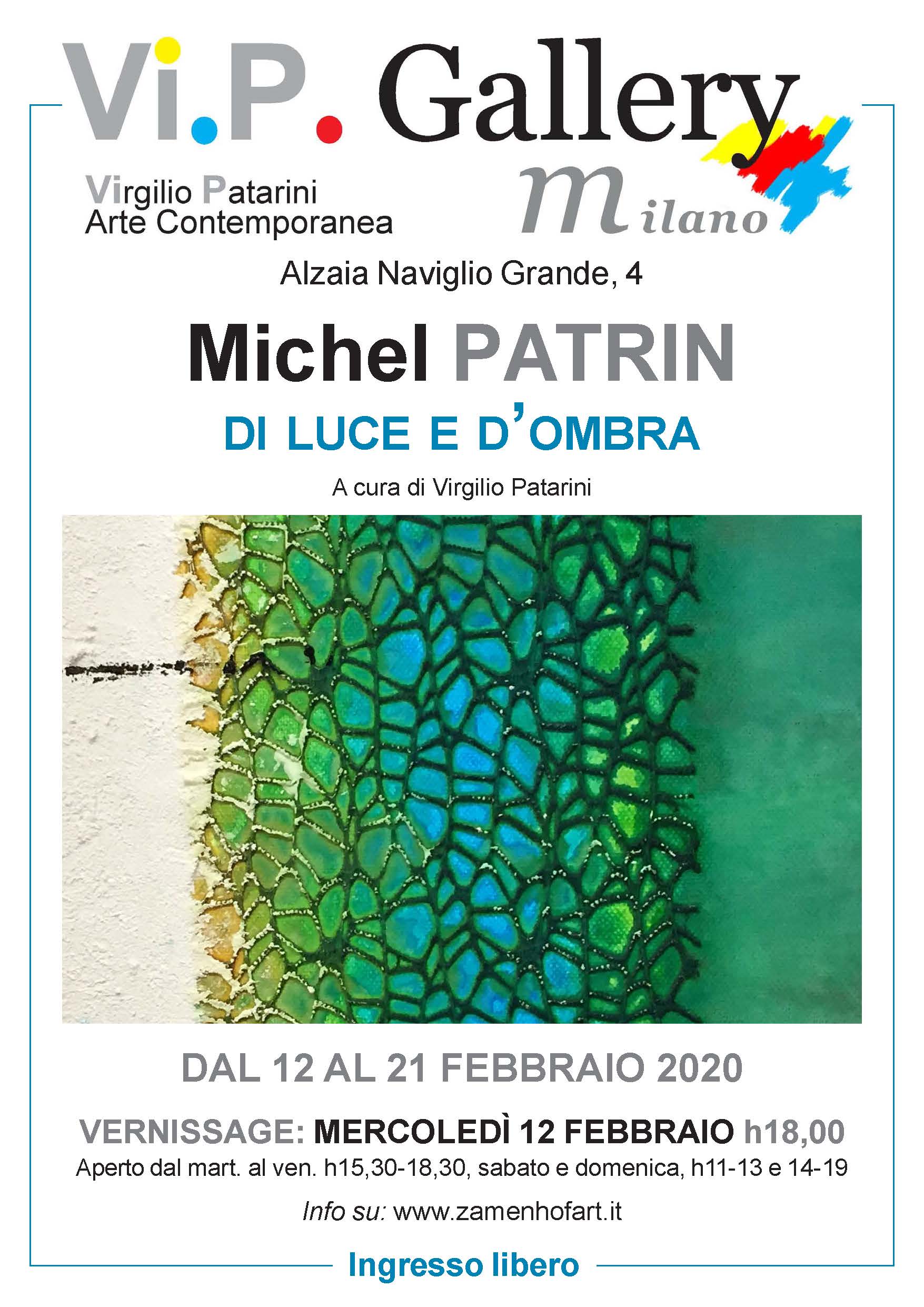 Si inaugura mercoledì 12 febbraio 2020, dalle ore 18,00 alla Vi.P. Gallery di Milano, in Alzaia Naviglio Grande, 4, la mostra personale del pittore Michel Patrin intitolata “Di luce e d’ombra”, che presenta una ventina di lavori recenti e recentissimi dell’artista romano di origini francesi.