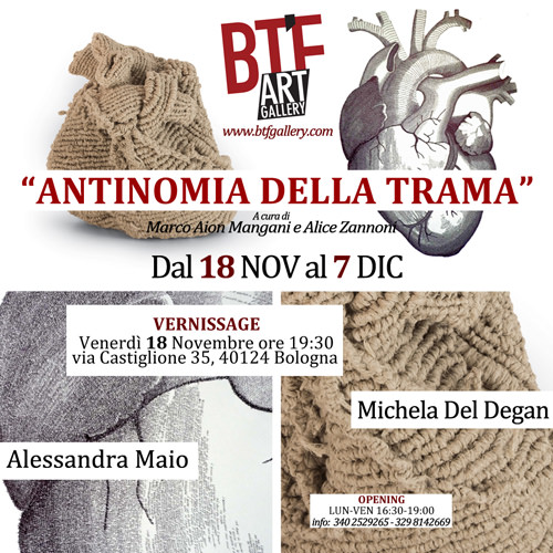 La mostra “Antinomia della Trama” gioca sulla diversità poetica dei lavori di Alessandra Maio e Michela Del Degan: una doppia personale che esalta il carattere individuale di ogni artista pur presentandosi ritmata come un distico nella proposizione curatoriale che intende mostrare il potenziale dell'intreccio come espressione fenomenica di un sentire.