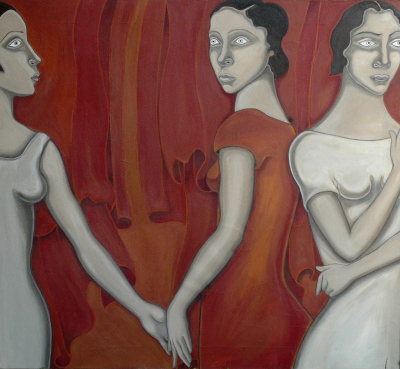 Questo stravolgimento del significato effettivo, questo straniamento del comune senso della realtà sono la chiave di lettura dei dipinti di Michela Moretti, sorprendenti per la loro semplicità, che man mano si scopre essere un intrigo di minuziosi dettagli, un gioco al decorativismo nelle fogge degli abiti, nell’ambientazione, dovunque il colore possa ravvivare e rendere interessante anche l’esistenza meno brillante.