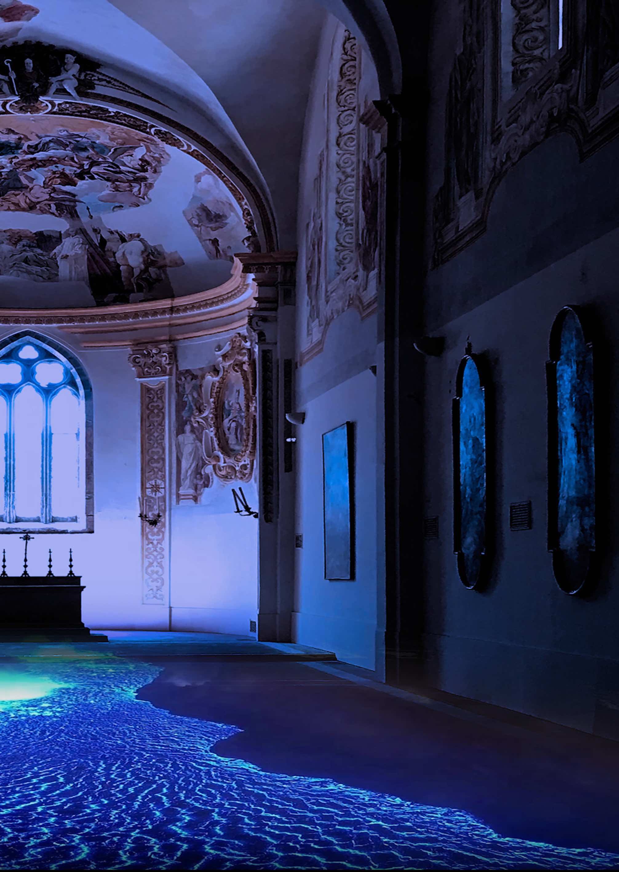 Al termine della imponente video installazione sul pavimento, un video ologramma raffigurante il fluido e collocato all'interno della cappella del Santo, completa il percorso espositivo.