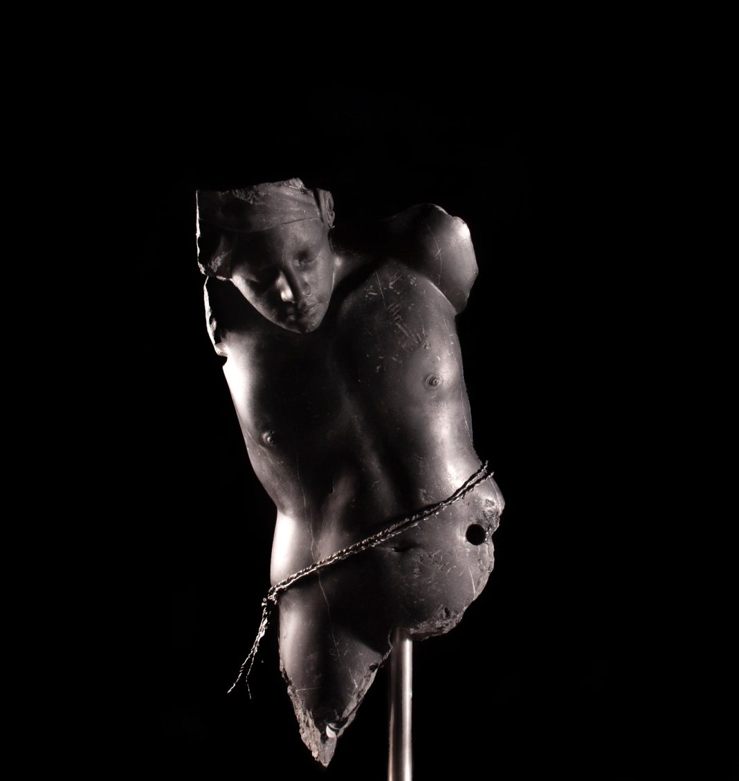 «Il San Sebastiano di Michelangelo Galliani – si legge nel testo di Marcello Bertolla in catalogo – ha il corpo scolpito su pietra, nel marmo nero, senza gambe e senza braccia, quasi reperto archeologico. La corda di piombo, legaccio che lo tiene fermo alla colonna, o alla palma, gli cinge la vita. Sono richiami poveristi che creano un cortocircuito con la concettualità dei raggi di luce ad alta direttività, i laser, le frecce scagliate contro di lui da un nuovo invisibile avversario. Il suo lavoro viene dal passato: egli scolpisce pietre, marmo e onice; lavora piombo e cera; utilizza il tempo come elemento creatore e creativo, aperto alla casualità e ai ripensamenti. Ma proprio per questo è simultaneamente moderno, “avanguardia” analogica in un mondo digitale».