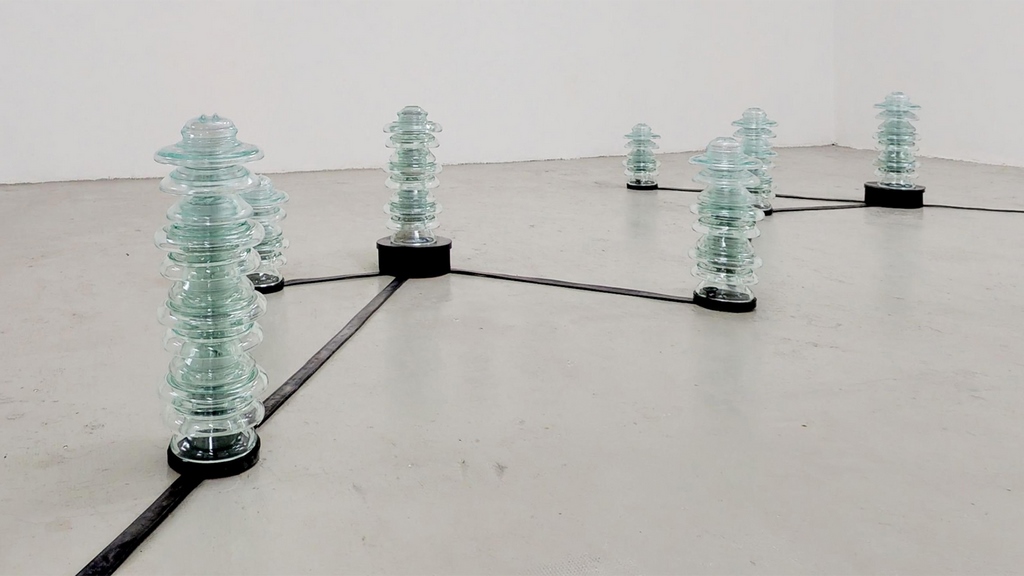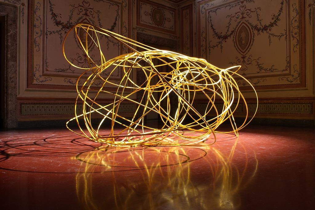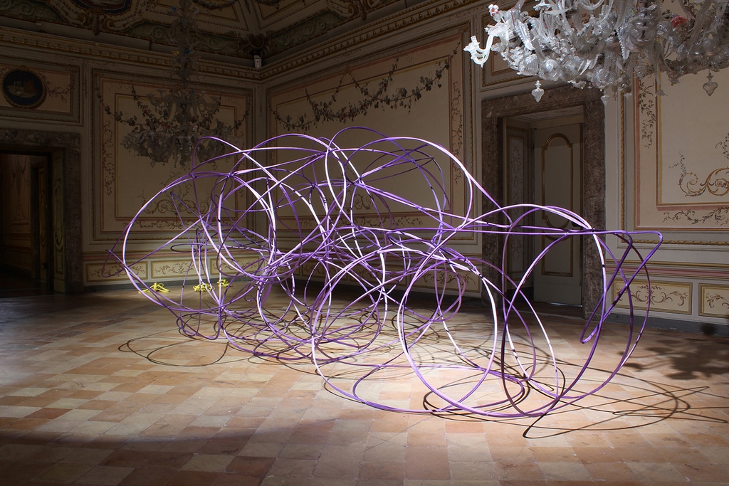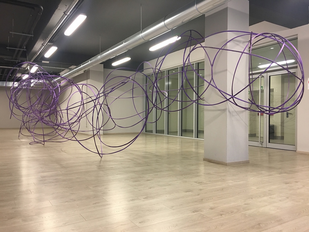 “Cronòtopo”, concepita all’inizio del 2019 e qui presentata in un nuovo allestimento, è un’istallazione a pavimento che configura, attraverso un algoritmo, l’assetto dei pianeti del sistema solare, riproducendo le frequenze da essi generate. “Pelagibacter” (2019) e “Roseobacter” (2019) sono installazioni site e contest specific, create cioè appositamente per gli spazi del CAMeC e ispirate allo studio scientifico dei batteri marini: grandi strutture, costituite da cinghie industriali sospese nello spazio del museo creano forme, in scala 20.000.000:1, ispirate a microrganismi scoperti la fine del XX e l’inizio del XXI secolo, fondamentali per stabilizzare la temperatura del nostro pianeta.