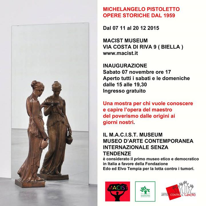 Al MACIST Museum si inaugura una mostra di rare Opere storiche di Michelangelo Pistoletto dal 1959 a oggi. "Opere storiche dal 1959" è una mostra pensata per chi vuole conoscere e capire l'Opera del Maestro del poverismo dalle origini ai giorni nostri. L'esposizione si compone di opere di pittura del 1959-60 ("L'uomo nero", "L'equilibrista", "Il pittore"), quadri specchianti di periodi diversi ("Girasoli", "Mollette", "La rosa", "Prima scena", ecc.), opere di scultura e installazioni (es. "Porta obliqua"). L'opera più significativa della mostra è certamente "Omaggio di Mercurio allo specchio" del 1971-92, che presenta forti analogie con la "Venere degli stracci" del 1967. l MACIST Museum (Museo d'arte contemporanea internazionale senza tendenze) è considerato il primo Museo etico e democratico in Italia a favore della Fondazione Edo ed Elvio Tempia per la lotta contro i tumori. Creato e diretto da Omar Ronda, il Macist raccoglie già una ricca collezione di oltre 150 opere dei massimi artisti internazionali delle avanguardie e delle avanguardie storiche.