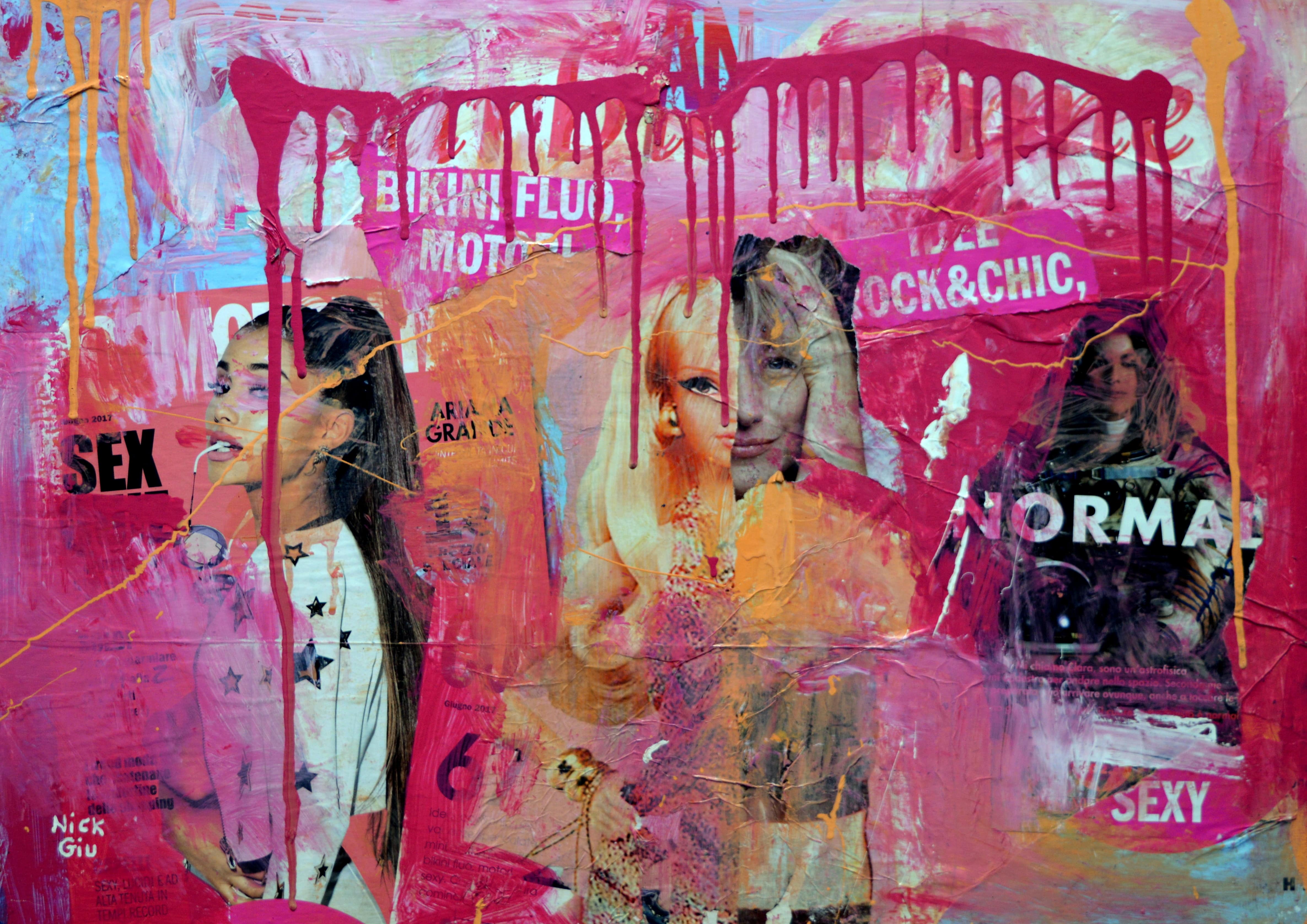 Il primo, seguace della Pop Art di Mimmo Rotella, sovrappone e stratifica su tavole in legno strappi di manifesti e riviste appartenenti a più mondi. Dalla moda alla musica, dal cinema allo sport. Soggetti che assumono una nuova connotazione grazie all’uso del colore che viene lasciato colare sui volti, talvolta noti, frammentati e in parte ancora riconoscibili. Lineamenti che si fanno portavoce del messaggio, talvolta di denuncia, dell’artista.