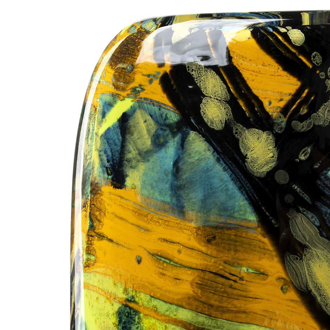 L’estetica di Michele Burato raccoglie le suggestioni moderne dell’action painting e dell’espressionismo astratto americano, del tachisme e dell’informale europei, legandosi però alla millenaria tradizione della lavorazione del vetro di Murano, di cui esplora soprattutto colori e possibilità compositive.