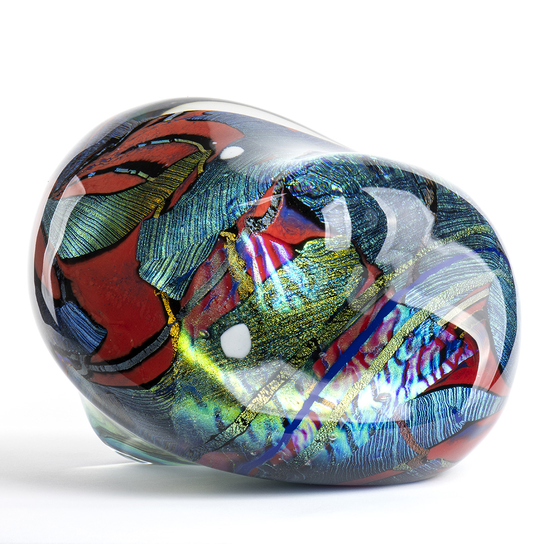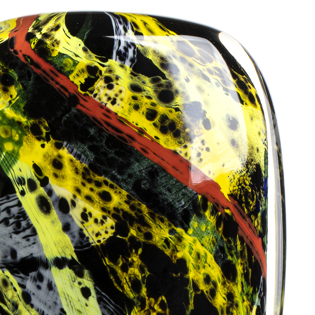 Partendo infatti dalla lavorazione meticolosa in studio di trame e composizioni complesse su lastre di vetro, Burato porta avanti un’indagine alchemica e scientifica sui materiali, sulle loro reazioni e relazioni. Le opere prendono poi la loro forma finale in fornace a Murano, dove vengono plasmate in sculture tridimensionali.