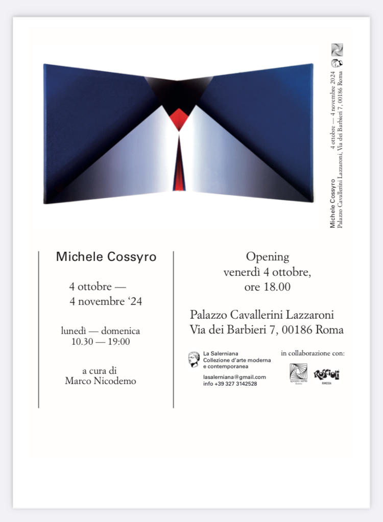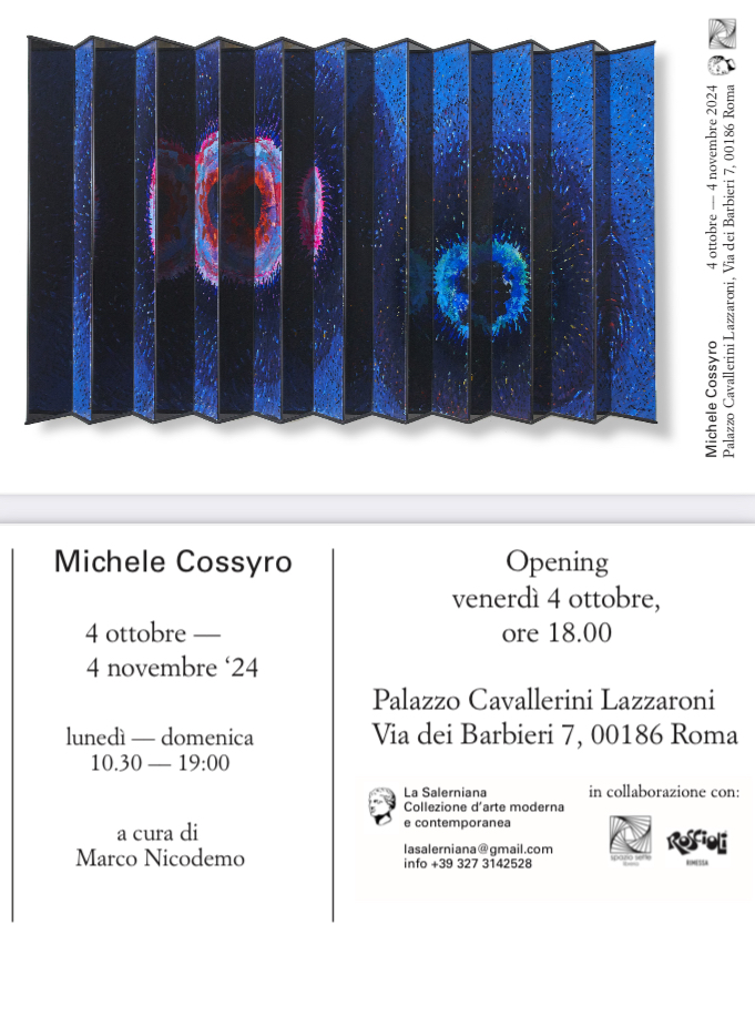 Prosegue la collaborazione tra Spazio Sette e la Collezione d’Arte Moderna e Contemporanea – La Salerniana, presentando, per l’occasione, la mostra personale di Michele Cossyro, a cura di Marco Nicodemo, nelle prestigiose sale di Palazzo Cavallerini Lazzaroni, in via dei Barbieri n. 7, a Roma.