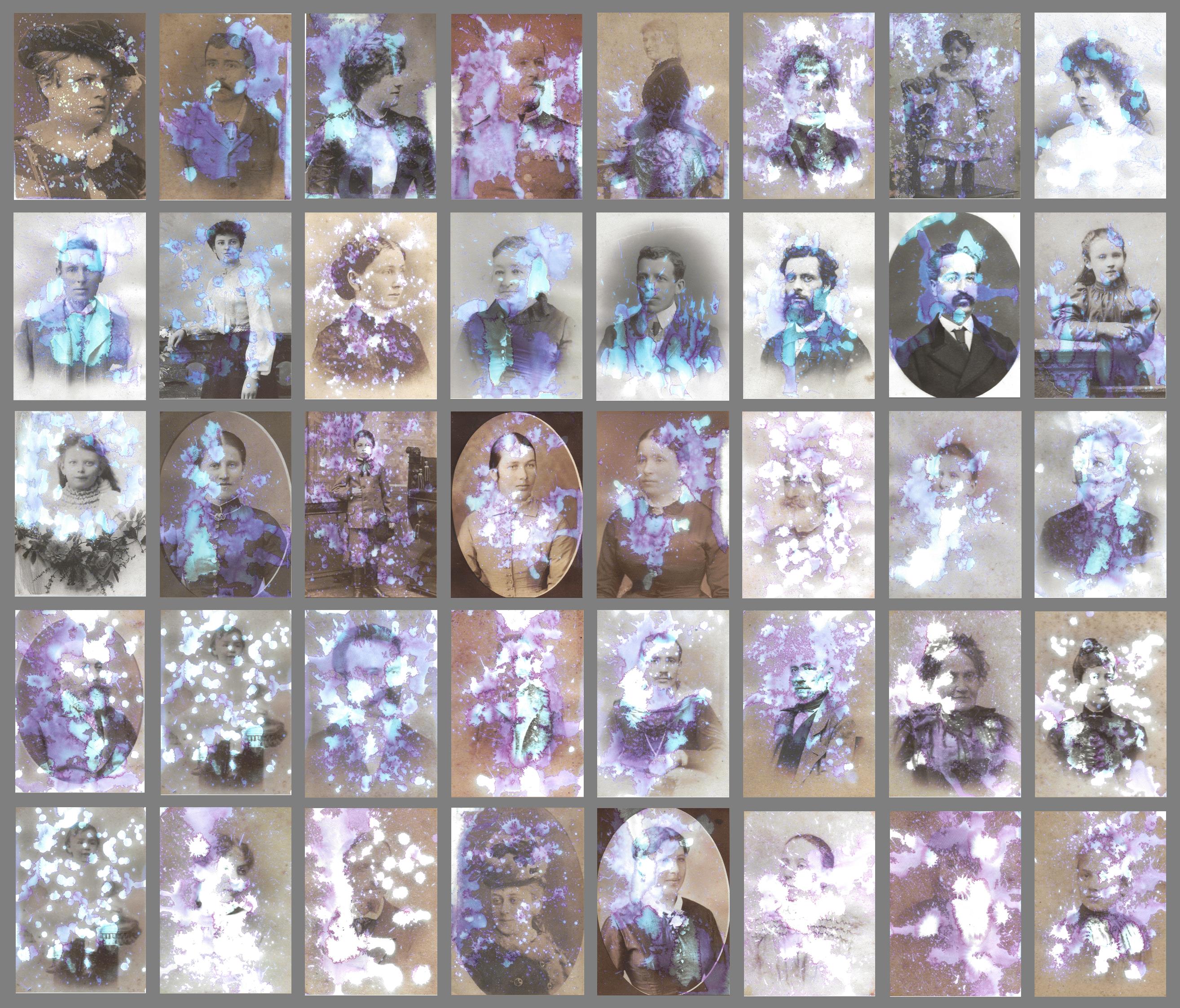 I ritratti fotografici ci trasmettono qualcosa di un’epoca ormai perduta, sui quali si è depositata la patina del tempo. Su questi ritratti Michele Dolz interviene depositando macchie di acido, corrodendo il bianco e nero della superficie, per portare alla luce il segno di esistenze individuali e di storie irripetibili.