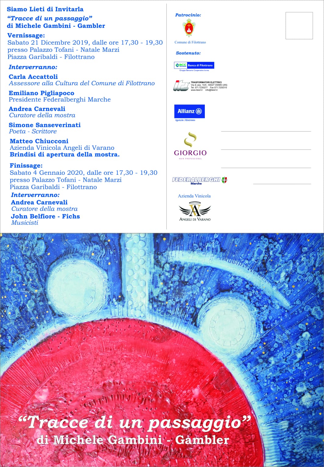 L’avvincente rapporto tra arte contemporanea e letteratura è il tema della mostra Tracce di un passaggio di Michele Gambini, dal 21 dicembre al 4 gennaio al Palazzo Tofani Marzi di Filottrano (An). Le quaranta opere, selezionate dal curatore Andrea Carnevali, raccontano la storia personale del pittore. In mostra sono, inoltre, esposte alcune opere dedicate al paesaggio italiano e di oltreoceano. L’inaugurazione è il 21 dicembre, alle 17,30. Interverranno: l’assessore alla cultura e al turismo Carla Accattoli, il presidente di Federalberghi Marche Emiliano Pigliapoco, il curatore Andrea Carnevali, il poeta Simone Sanseverinati, Matteo Chiucconi dell’Azienda Vinicola Angeli di Varano (An). La mostra ha ottenuto il patrocinio del Comune di Filottrano.