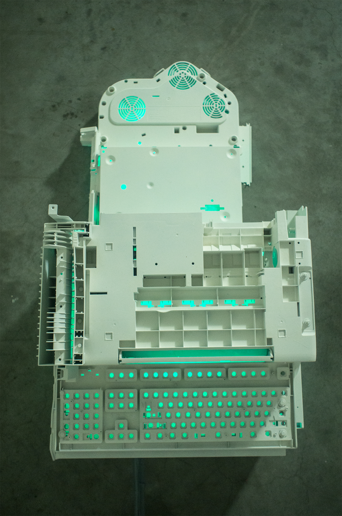 RoomScape di Michele Liparesi (Bologna 1986) ci offre in principio un’esperienza simile. L’ambiente ricorda un ufficio anonimo, semibuio. I macchinari bianchi – per un uso difficilmente identificabile– emanano una luce sintetica e costante; sono disposti senza un apparente ordine ma nell’insieme costituiscono un paesaggio o, più precisamente, uno scheletro di paesaggio: un’urbe di forme essenziali, vagamente familiari. RoomScape si distingue per un’impostazione minimalista, rinuncia all’espansività plastica costruendo tuttavia un luogo quasi nostalgico.