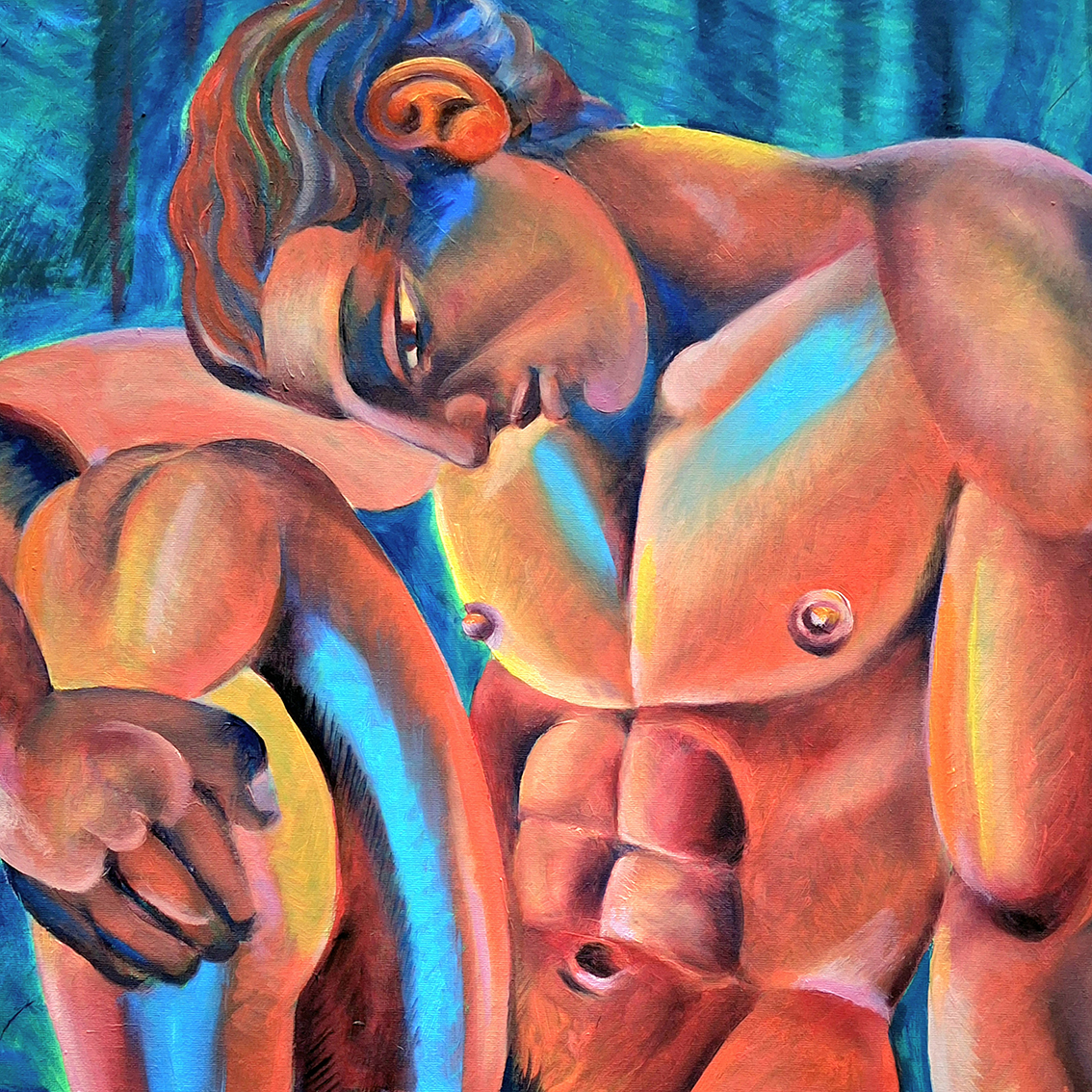 La prima sezione della mostra è un omaggio a Wilhelm von Gloeden, fotografo che, tra la fine dell’Ottocento e i primi del Novecento, ricreò scene arcadiche ispirate all’immaginario dell’antica Grecia, popolate da giovani siciliani nudi che interpretavano efebi e satiri in un’atmosfera bucolica di immobilità eterna. Quello di Gloeden era un mondo utopico nel quale fondare un modello di vita basato sulla bellezza e la ricerca del piacere dei sensi. Con la stessa missione, Massarenti riprende l’ideale di Gloeden ma utilizzando la pittura, insieme a un moderno taglio fotografico con il quale isola e inquadra porzioni di corpi e ritratti. Il risultato finale è una costellazione di piccoli dipinti che, nell’insieme, assumono l’impatto di fotogrammi cinematografici.