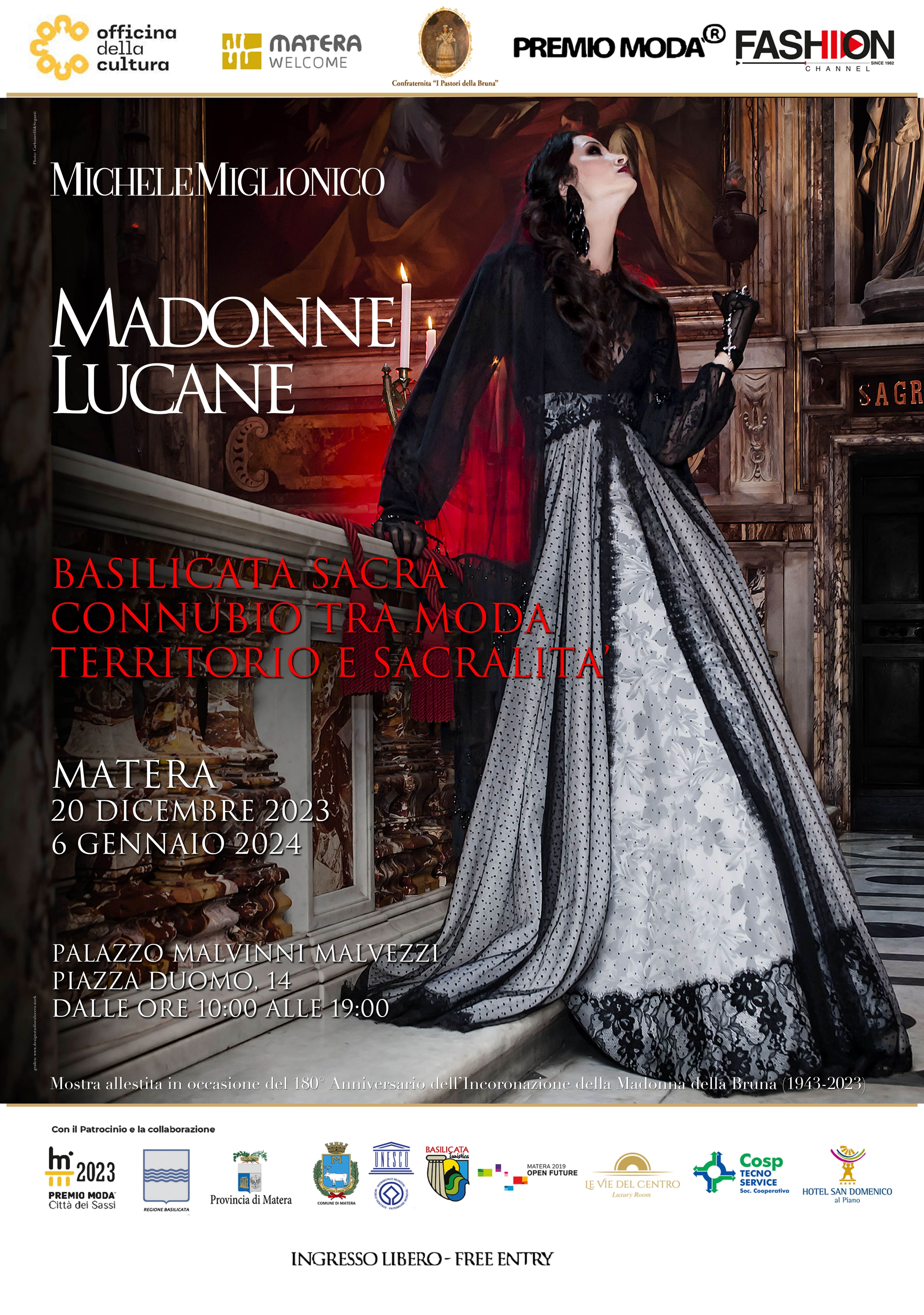 L’Associazione APS “Officina della Cultura” presenta, in occasione del 180^ Anniversario dell’Incoronazione della Madonna della Bruna (1843-2023), la mostra di Alta Moda “Michele Miglionico: Madonne Lucane” - Basilicata Sacra (Connubio tra Moda, Territorio e Sacralità) che si svolge nel Palazzo Ducale Malvinni Malvezzi in Piazza Duomo, 14 – Matera