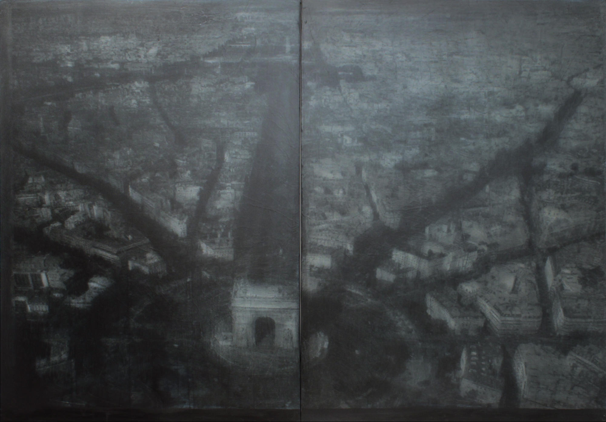 Il tema della perdita come anche quello dell’attrazione per ciò che non esiste più o è distante costituiscono i caratteri comuni delle opere presenti in mostra. Anche quando il soggetto è tratto da una scena contemporanea, come nella spettacolare veduta aerea di Parigi intitolata Arc de Triomphe, la presenza attuale degli elementi rappresentati sembra solo il primo passo per la loro prossima distruzione e futura dimenticanza.