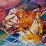 Abbracci: astrazioni cromatiche ed espansioni dinamiche da cui emergono corpi (quanti nudi, e quante aggettivazioni: seduto, sensuale, piegato, roseo, plastico, frontale, laterale, giallo, dormiente …) di donna e di uomo, e parti di essi: mani, profilo, rotondità, retro …
