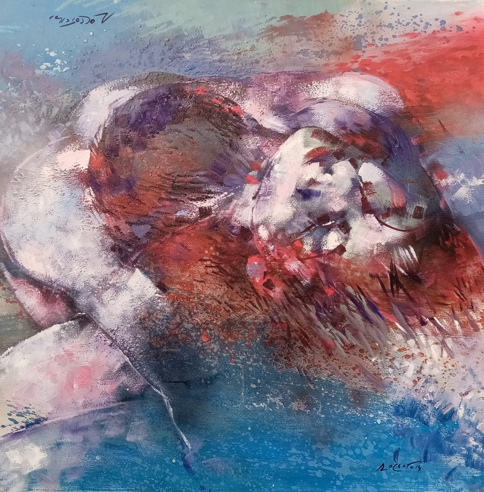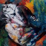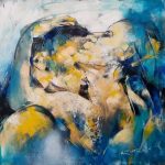 Da leggere secondo differenti tracciati e modalità, tenendo ben presenti alcuni presupposti da cui non poter prescindere. Primo tra tutti il tempo del fare, con il localizzarsi della totalità delle opere nel quinquennio che va dal duemiladiciotto al duemilaventidue, tranne due che dal duemilaventi vanno indietro di ben sei anni confermando così la continuità operativa ben evidente nell’analisi del suo modus operandi, assolutamente personale e coerente. Ribadita, a ben guardare, nelle altre opere dislocate negli anni, nelle quali le precedenti attenzioni tematiche di Roccotelli, tutte legate alla naturalità, urbana o ancora più ampia, si modificano secondo un’astrazione progressiva, assumendo nuove connotazioni/sembianze più figurali. Puranco embrionali, ma assolutamente tali. Quindi il colore e la materia, l’una propedeutica all’altro e viceversa, nella costruzione di uno spazio pittorico astratto nel quale i punti di osservazione si moltiplicano e si sovrappongono, tra ristagni cromatici ed improvvise linee di fuga effervescenti che alludono a forme ben identificate ed identificanti, giocando sull’allusione e sul ricordo. Perfino quello degli studi/approfondimenti effettuati nel tempo e del mestiere a lungo esercitato e manifesto. Astrazioni cromatiche ed espansioni dinamiche da cui emergono corpi (quanti nudi, e quante aggettivazioni: seduto, sensuale, piegato, roseo, plastico, frontale, laterale, giallo, dormiente …) di donna e di uomo, e parti di essi: mani, profilo, rotondità, retro … . O forse, solo la loro memoria, in quell’essere l’uno e/o l’altra, e l’uno e l’altra insieme. Come, appunto, negli “Embrace” dell’ultimissimo periodo. Nei quali Michele Roccotteli propone una sorta di geografia del corpo, vista attraverso la tematica dell’abbraccio con il suo essere materico, naturale, informe, rosso, avvolgente, audace … nella ri/scoperta del bacio (giallo, notturno, … e strutturato in polittici) … e infine in quella fusione di corpi che è l’amplesso. Facendoci riandare ad alcune sue precedenti prove, ma anche e nuovamente, al lungo percorso della storia dell’arte e a quel suo costante muoversi tra sensualità ed erotismo, spingendoci a ri/fermarci su questi suoi recentissimi dipinti che, in un crescendo di intensità emotiva, attualizzano la proiezione della fisicità dei corpi in quella dimensione immaginativa, misteriosa e misterica che caratterizza l’animo umano e identifica i sentimenti. Approdando a “La petite seconde d’éternité/Où tu m’as embrassé/Ou je t’ai embrassée”, di cui scrive Jacques Prévert, ovvero alla sospensione del tempo.