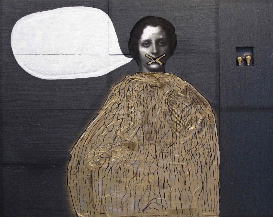 L’opera, realizzata dall’artista veneziano nel 2015 con tecnica mista, affronta il tema della violenza contro le donne, ponendo particolare attenzione all'incapacità di reazione e di rivalsa. La caratteristica "X" sulla bocca, uno dei simboli pittorici ricorrenti di Tombolini, rappresenta la censura e il silenzio imposto, impedendo alla donna di urlare, denunciare e dar voce al proprio dolore.