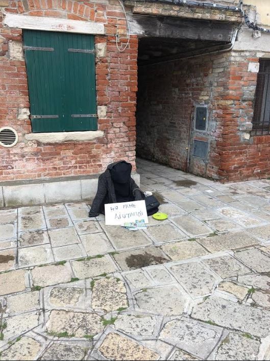 manichino rappresentante la mendicante in vari punti del centro storico di Venezia, e in una