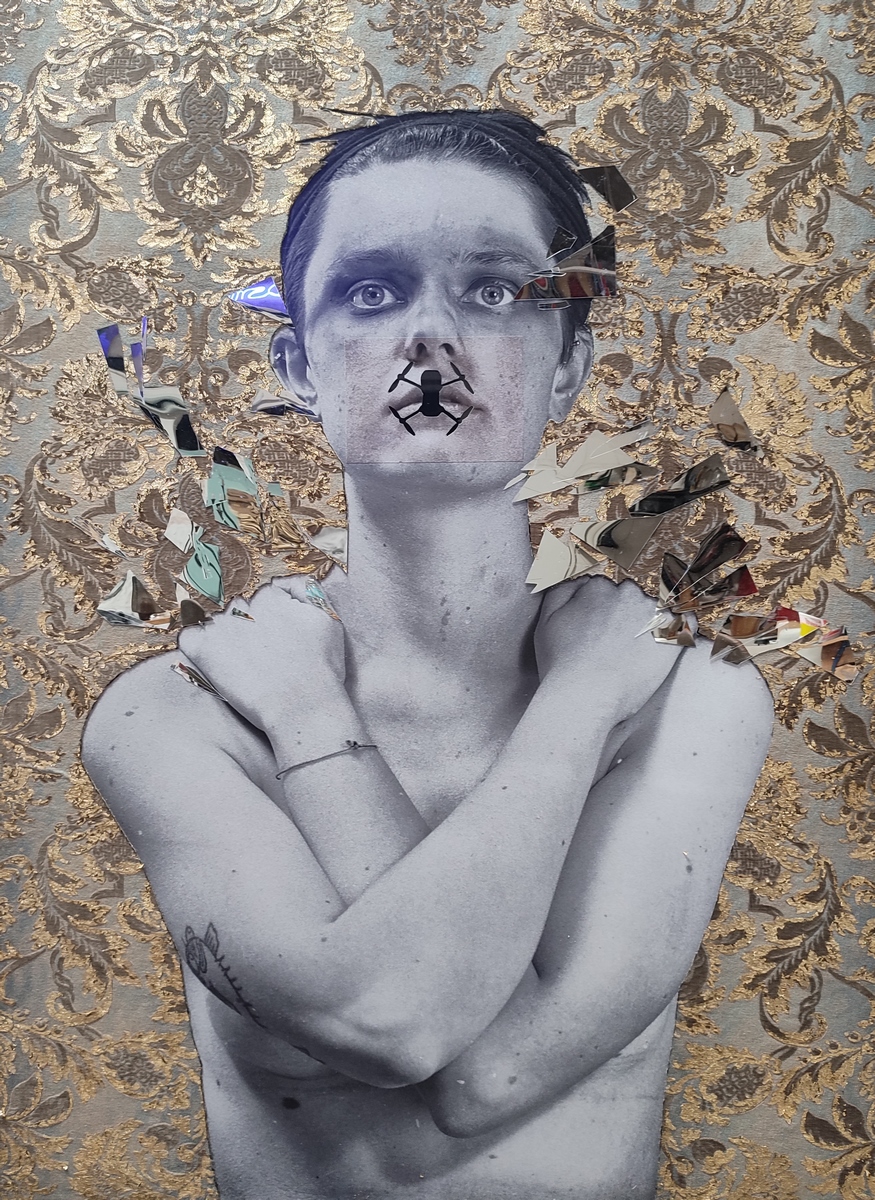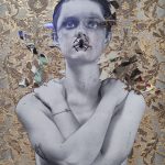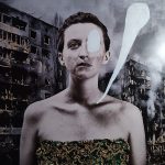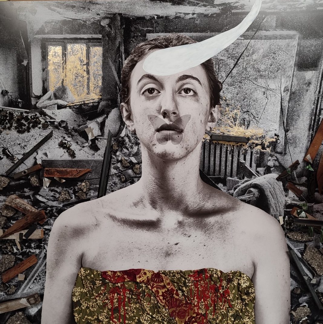 “Control” rappresenta il volto di una donna con un drone in bocca, elemento grafico che si illumina, si ingrandisce e rimpicciolisce, generando il suono angosciante di un elicottero. “Mask” ritrae una ragazza con una maschera sul viso, al cui interno vengono proiettati filmati di bombardamenti assordanti relativi a varie epoche storiche, trasportando lo spettatore in uno scenario da incubo. In entrambe le opere, immagini di specchi rotti sullo sfondo enfatizzano ulteriormente un’idea di distruzione e desolazione. Le ultime due opere, più grandi rispetto alle altre, trasmettono invece un messaggio di speranza. “The Hope” e “Don’t forget” raffigurano due ragazze che, allontanandosi dai palazzi distrutti alle loro spalle, sembrano avvicinarsi allo spettatore. Indossano abiti preziosi, materici, in rilievo, come se fossero in procinto di andare ad una serata elegante. Un evento di rinascita, di ritorno alla vita. Sulla bocca una farfalla, simbolo che nell’alfabeto dell’artista è da sempre un messaggio di luce.