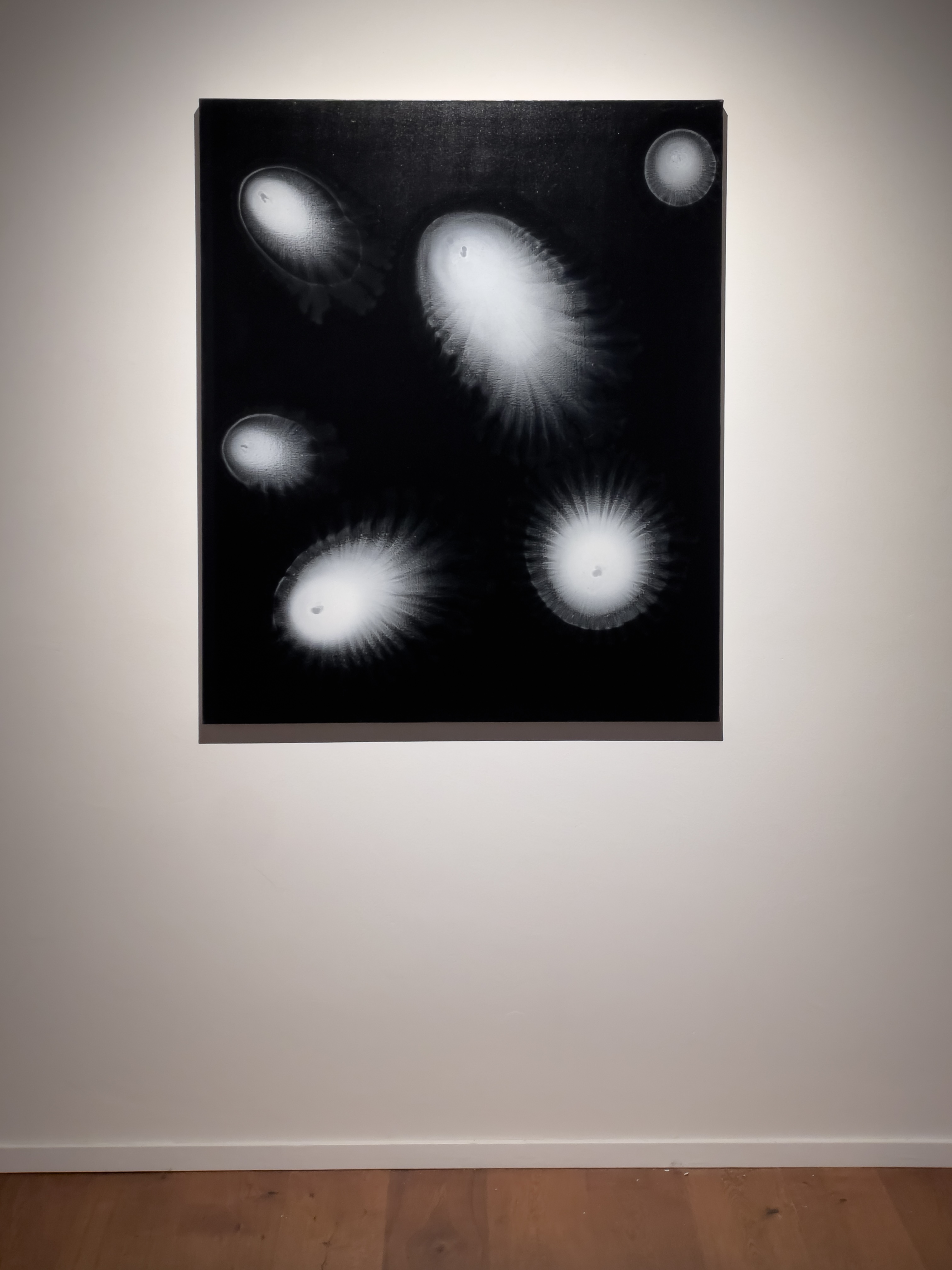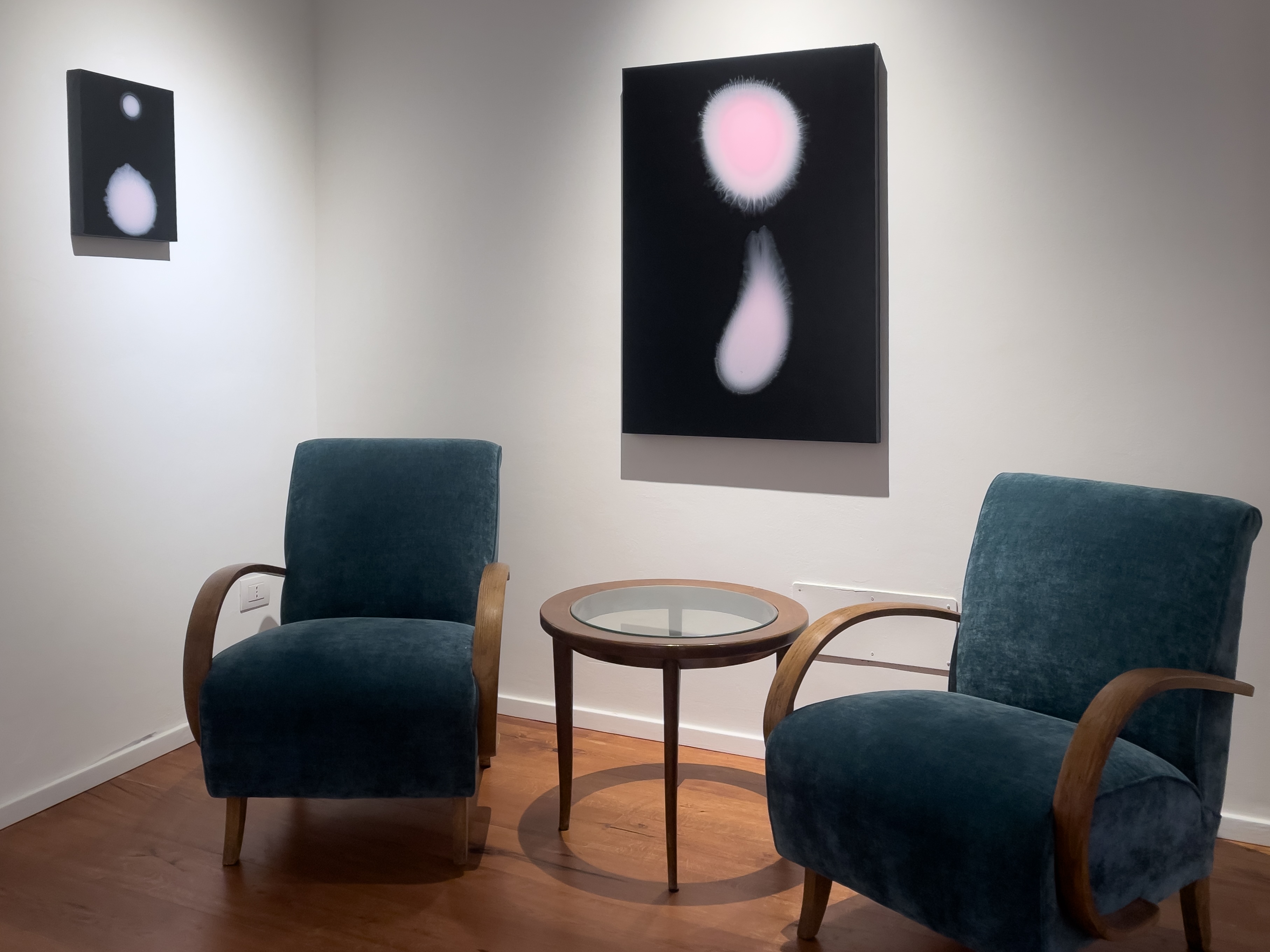 I dipinti di Letizia Galli, creati appositamente per questa occasione, sembrano rappresentare l’universo super concentrato dell’ infinitamente piccolo, o alludere agli spazi siderali infinitamente grandi. Si tratta di una serie di opere di grande maestria tecnica e raffinatezza di esecuzione.