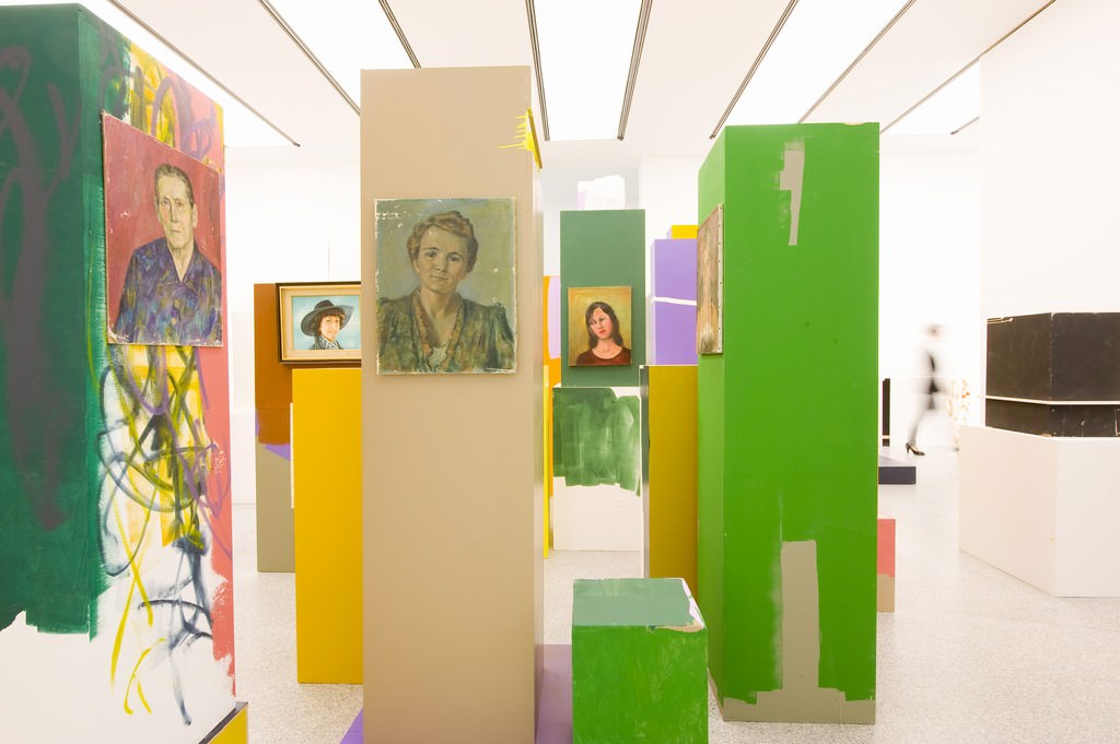 Sono soprattutto le forme sculturali a subire un’appropriazione e un remix da parte degli artisti in mostra. È quanto avviene con l’opera Trees for the Forest, (2007) dalla Collezione Migros, in cui l’americana Rachel Harrison investiga le convenzioni della scultura del XX secolo e riassegna al piedistallo un ruolo rilevante. Su quella che a prima vista sembra una fitta foresta di steli di legno a tinte forti, l’artista deposita un barattolo di frutta sciroppata o una pila di riviste e alcuni oggetti fatti a mano. “Sporcando” intenzionalmente la selva di piedistalli, Harrison toglie al lavoro ogni canone classico e lo mette in relazione con un’esposizione quotidiana di merci.
