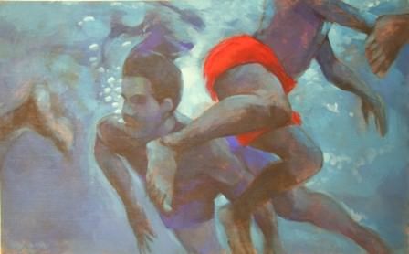 “Dal mare e dalla terra: scene subacquee e scena di guerra. In questa poche parole è racchiuso il mondo pittorico di Mikaël Kerboas. Un mondo in parallelo e dicotomico, con scene che si stagliano nell’immaginario e spiazzano allo stesso tempo. L’artista ci offre un panorama sorprendente di luoghi, capace di dare una lettura approfondita nell’incontro tra persone e le storie diverse. Il viaggio parte dall’acqua, o meglio dal mare, dove Kerboas ferma i momenti in uno spazio insolito: allontana l’uomo dalla suo vivere e lo trasforma in un essere acquatico, quasi come i pesci, esseri lontano a noi: loro respirano ossigeno in acqua, noi respiriamo aria, loro si lasciano trasportare dalle correnti, noi camminiamo affannosamente sulla terra. Un rapporto quasi ancestrale ed amniotico, dove l’uomo si annienta, non parla, non agiste, galleggia, si muove e ripercorre il ritorno nel ventre della Madre Natura, facendone parte in maniera indissolubile. Ed ecco che il giovane pittore francese, coglie di nuovo l’uomo in una nuova metamorfosi, che come un anfibio abbandona le acque e si colloca sulla terraferma, nella figura insolita di soldato. Fanno parte di questo ciclo i potenti dipinti di scene di guerra, dove le sagome scure ed armate dei soldati attraversano i campi fioriti. Si penserebbe immediatamente a un militante della violenza, affannato nella ricerca di ammazzare un suo simile, ma qui la scena è ben altra, il soldato sebbene sia munito di armi sembra un pacifico campagnolo che si immerge nelle distese delle praterie. Un contrasto molto forte, reso ancora più evidente dalle tonalità rosate addolcite del cielo al tramonto (o è l’alba di un giorno nuovo, forse di pace?).