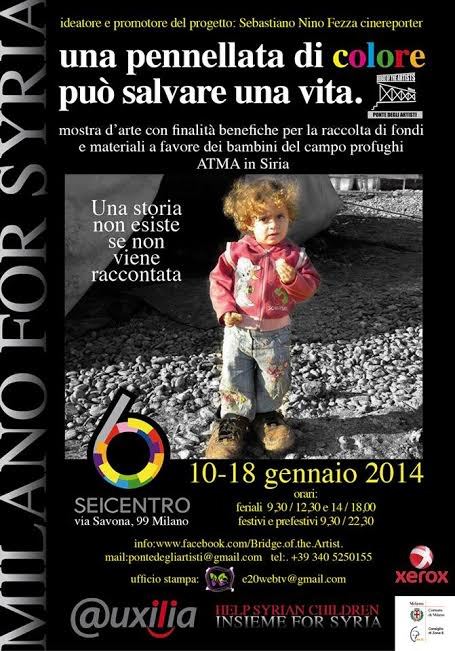 Ideata dal cineoperatore RAI Sebastiano Nino Fezza, in collaborazione con Auxilia Onlus, Associazione Ponte degli Artisti e oltre, Spazio Seicentro Milano, “Milano for Syria” è una mostra che si terrà dal 10 al 18 gennaio e che avrà come protagonisti i bambini vittime della guerra in Syria.