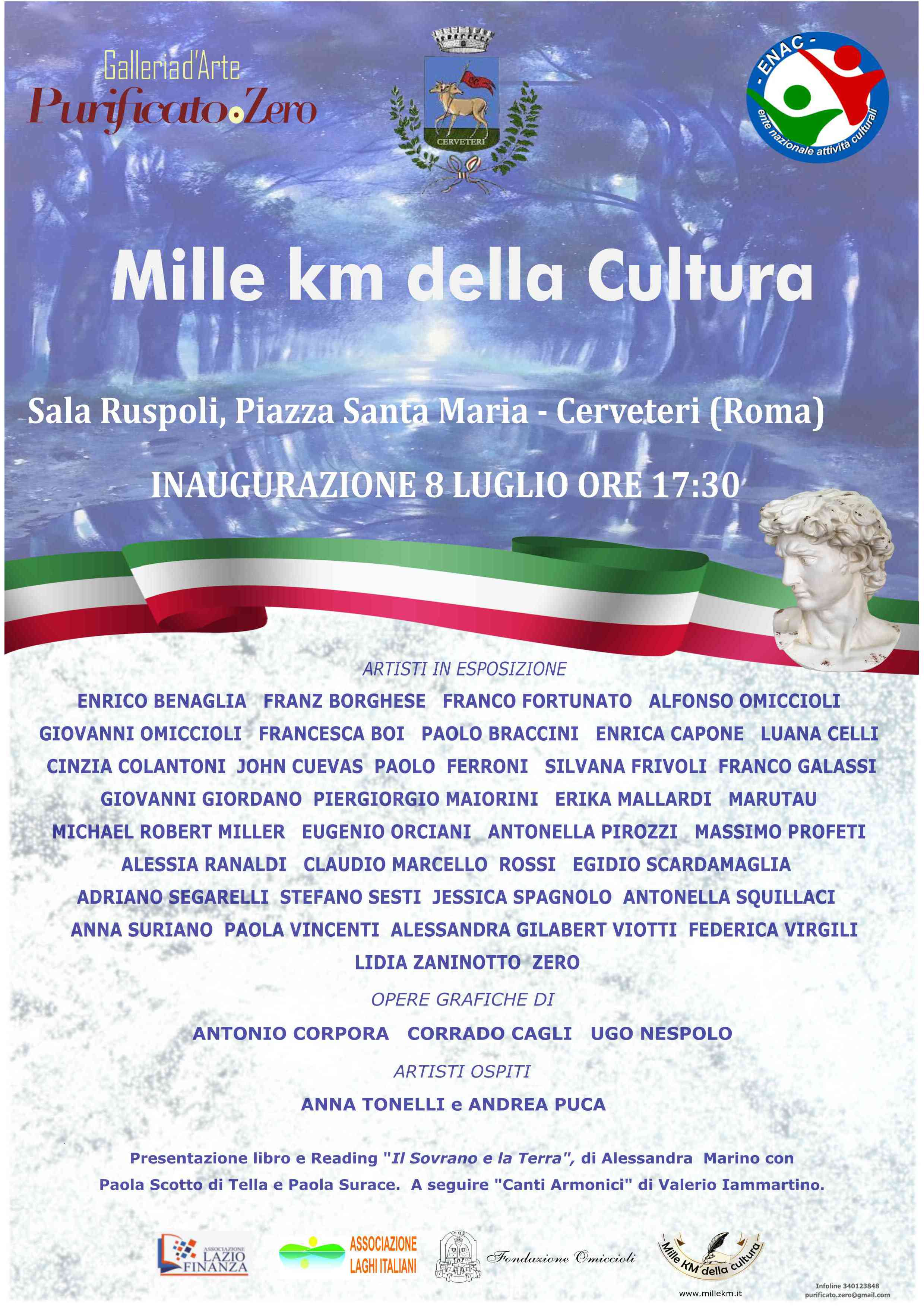 Dopo il successo della prima edizione, ritorna la manifestazione artistica itinerante Mille Km della Cultura, organizzata dalla Galleria d'Arte Purificato.Zero e ENAC (Ente Nazionale Attività Culturali). Quest'anno il tour si snoda lungo alcune importanti città etrusche, con inizio dal sito Unesco di Cerveteri presso le sale del Palazzo Ruspoli in Piazza Santa Maria. Un viaggio di circa 5 mesi all’insegna delle arti visive, con lo scopo di promuovere la diffusione della cultura e delle bellezze del territorio, i suoi tesori e la storia dei luoghi.