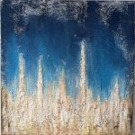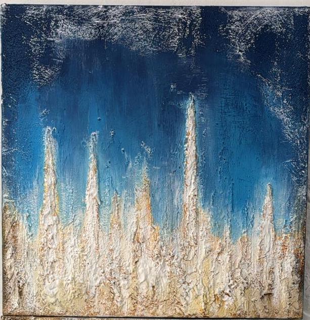 Milva Bacchelli, con "Sintesi", ci conduce in un suggestivo viaggio lunare, evocando attraverso tonalità di bianchi, grigi e vari azzurri e blu, la vastità e la quiete dei paesaggi astrali. Le sue tele, con densità cromatiche corpose, creano un’atmosfera di contemplazione e silenzio, invitando il visitatore a immergersi in una dimensione di bellezza e introspezione.
