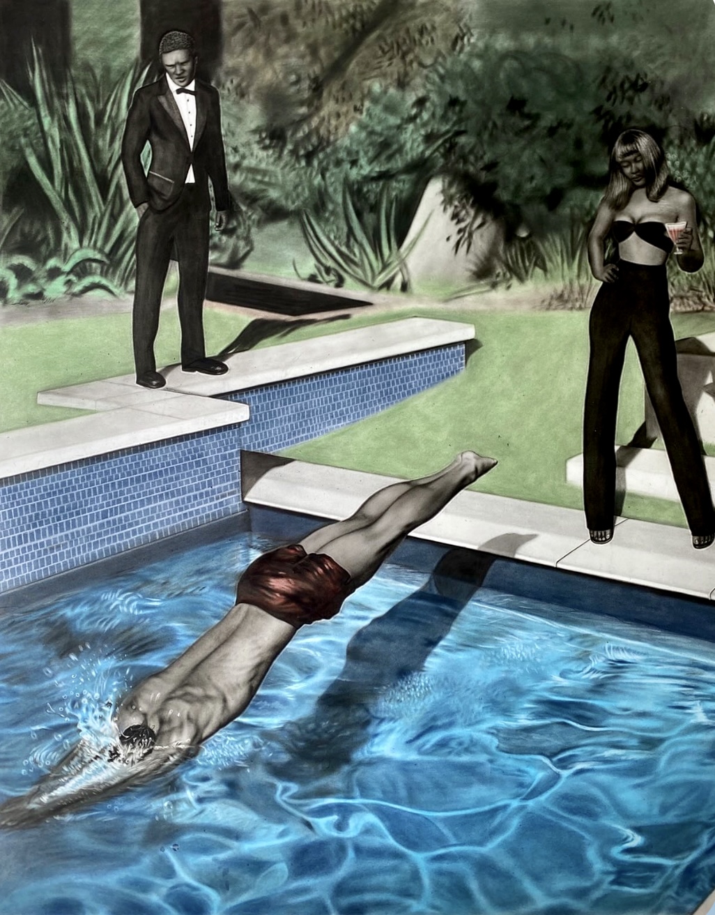 Joseph Chimerie usa il colore con sfumature così impalpabili e morbide come se fosse un maquillage sul volto di una modella. La sua è un’opera che si potrebbe definire fashion, ma non nell’accezione di moda, ma di eleganza. Le sue figure sono avvolte nella profondità prospettica come se fossero all’interno di una scatola magica e si potessero prelevare e muovere. La plastica delle forme è realistica e i personaggi che rappresentano la scena sono delicati, raffinati e si muovono come su una passerella. La sua è una messa in scena di una realtà ovattata con personaggi di attraente bellezza dei volti e dei corpi, nelle delicate armonie dei colori, in uno spazio fisico anch’esso pervaso da una luce e da una sinuosa eleganza, anche l’acqua della piscina