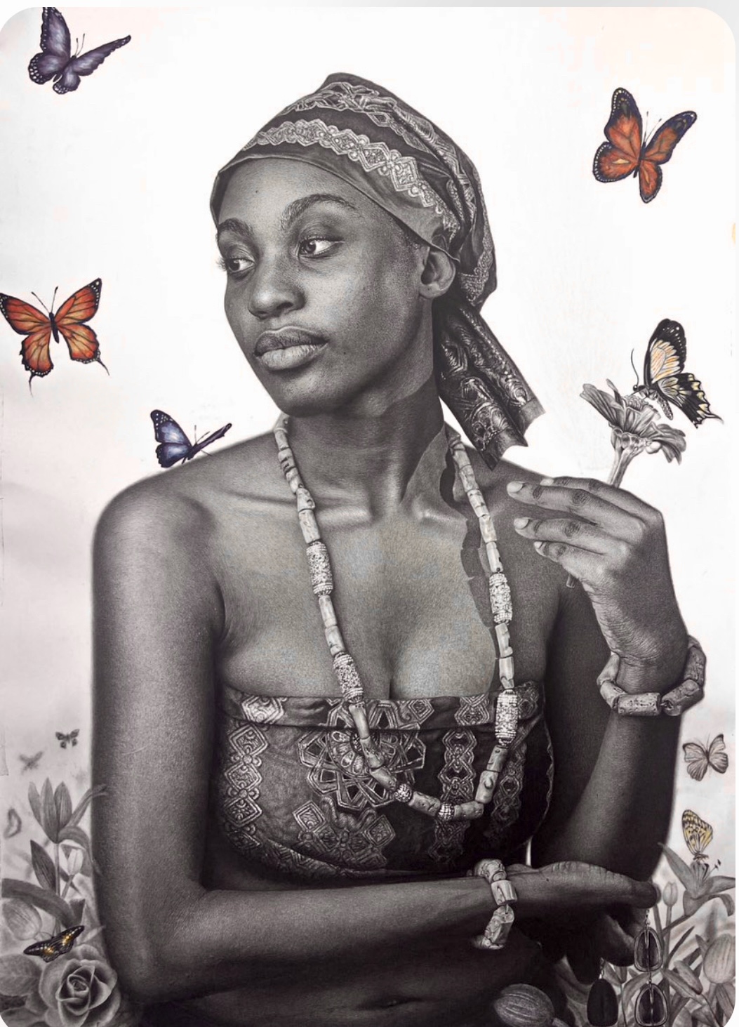In “Butterfly” il soggetto è inserito su uno sfondo bianco, neutro, il volume della figura si definisce attraverso la linea precisa delle spalle e della testa, i particolari del copricapo e della collana minuziosamente intagliata vengono colpiti dalla luce vibrante che crea sul corpo un volume di ombre. Ma sono le farfalle colorate che estraniano l’osservatore e catapultano il soggetto in uno spazio tra il bucolico e il surreale. Ed è l’elemento estraniante colorato, ancora più evidente nell’opera “Apple” dove le mele sospese nello spazio trasformano l’opera da iperrealista a surreale e ci catapultano in una realtà sospesa e immaginaria.