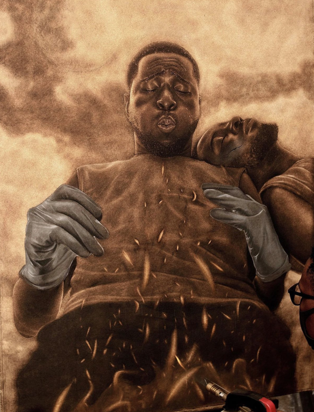 Il lavoro di Peter Idoko colpisce per la capacità che la materia bruciata acquista nell’opera in “Strive” il soggetto e la tecnica si confondono il personaggio in primo piano soffia verso il fuoco, l’inquadratura dal basso potenzia il contenuto , il calore del fuoco sembra uscire fuori dal quadro sentiamo invaderci dal calore delle fiamme, ci distoglie l’attenzione, solo il personaggio con la testa poggiata sulla spalla del soffiatore, qual è il suo ruolo nella storia? È allora che l’immagine in un turbinio di idee comincia a prendere forma si catapulta verso nuove aspettative, l’artista non sta solo rappresentando un atto, ma sta raccontando un sentimento, una sensazione.
