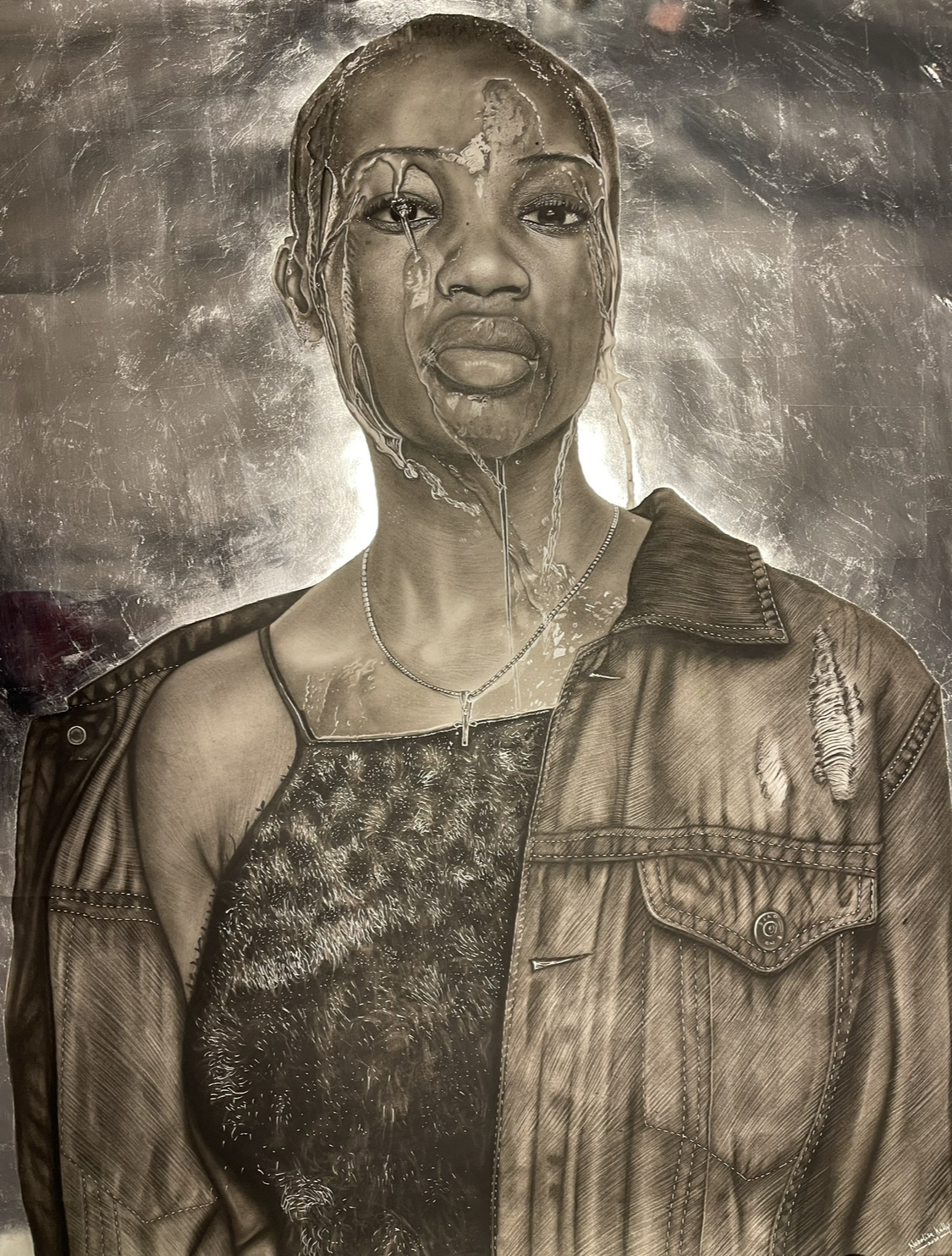 Nebolisa Kelly è l’artista iperrealista nigeriano per eccellenza, sia per i suoi soggetti sia per la tecnica, ci sono tutti gli elementi: i ritratti in formato magnum, l’acqua che invade il volto, l’utilizzo del chiaroscuro denso e sostanzioso di particolari.