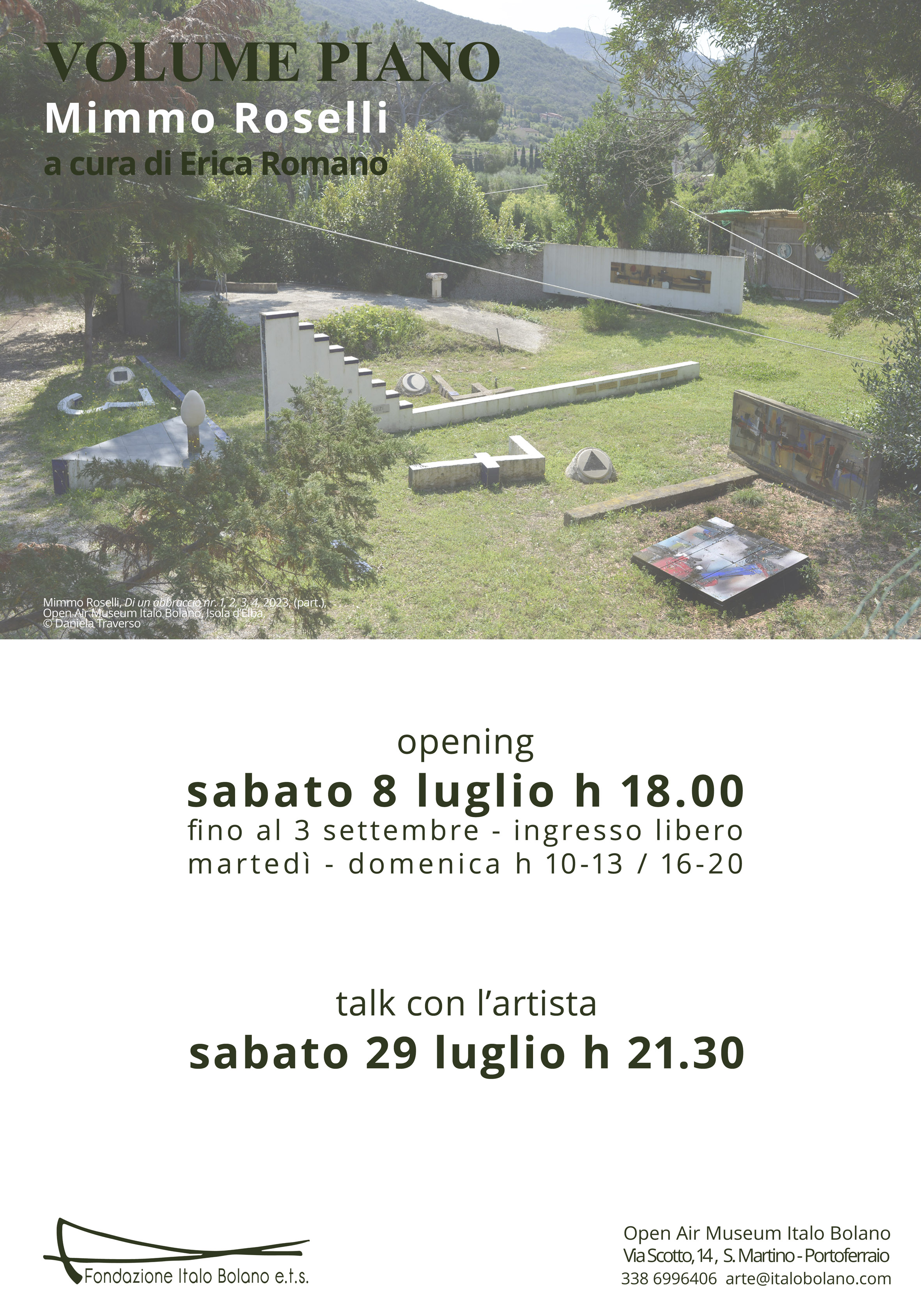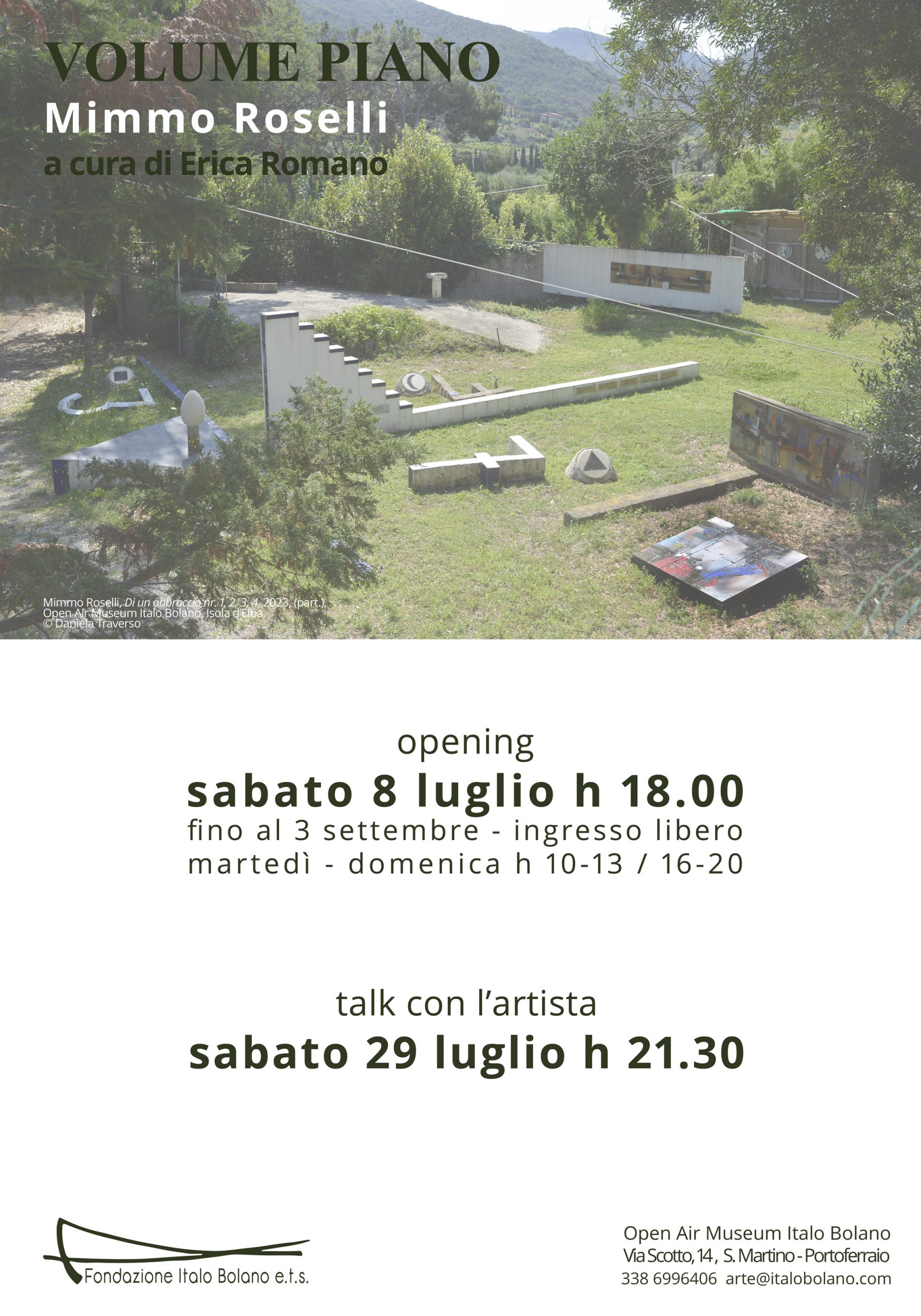 Sabato 8 luglio ore 18.00 inaugura Volume piano di Mimmo Roselli (Roma, 1952) presso l’Open Air Museum Italo Bolano all’Isola d’Elba (Via Scotto, 14 – San Martino, Portoferraio). La mostra personale, promossa dalla Fondazione Italo Bolano e a cura di Erica Romano, sarà visitabile fino al 3 settembre e porterà all’attenzione del pubblico italiano un artista di calibro internazionale. Roselli, infatti, torna in Italia dopo la partecipazione alla 55° Biennale di Venezia e dopo numerosi progetti espositivi che lo hanno visto impegnato in Europa (Germania, Svizzera, Repubblica Ceca, ecc.), negli Stati Uniti (da New York a San Francisco) e in Sud America, in particolare in Bolivia, terra eletta come seconda patria d’adozione dove si dedica alla realizzazione e promozione del Santa Rosa De Cuevo Festival, un evento a cadenza biennale dedicato alle arti e alla musica.