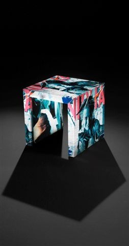 Sono così nati tavoli, cassettiere, librerie, credenze, armadi, consolle ottenuti scomponendo e rielaborando elettronicamente le opere originarie dell’artista. Riprodotte tramite sublimazione sulle lamiere zincate (in riferimento ai materiali usati dallo stesso Rotella) poi assemblate per formare il mobile, le opere sono rinate nella tridimensionalità di sculture ogni volta uniche nella loro identità oggettuale.