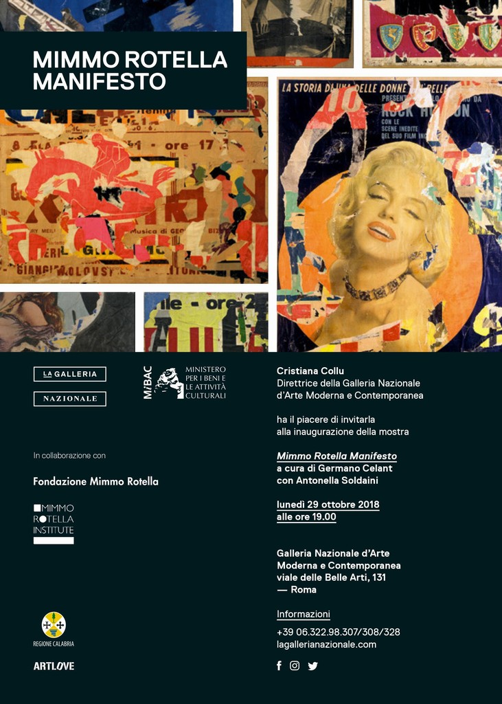 La Galleria Nazionale d’Arte Moderna e Contemporanea di Roma, la Fondazione Mimmo Rotella e il Mimmo Rotella Institute di Milano, sono lieti di annunciare la prossima apertura il 30 ottobre 2018 della mostra Mimmo Rotella Manifesto.